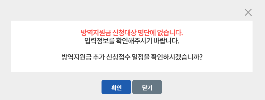 방역지원금 신청대상이 아니라면 위와 같은 화면이 나오며 확인을 눌러 오른쪽에 신청접수 일정 안내도 확인하시면 됩니다. 만약 신청 대상이라면 아래와 같은 화면이 나옵니다.