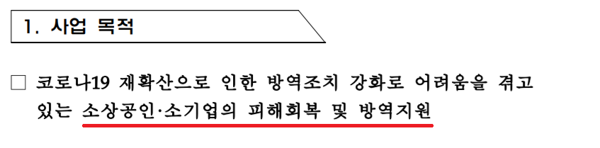 누구에게 왜 지급을 하는 것인지 간단하게 알 필요가 있는데요. 이번 사업의 목적은 요즘 코로나19로 피해를 겪고 어려워지고 있는 소상공인, 소기업들에게 지원을 한다는 내용입니다.