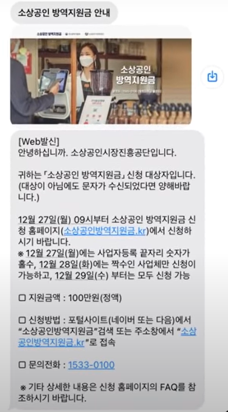 우선 신청 대상자이면 이런 문자가 옵니다. 12월 27일 월요일 9시부터 시넝이 가능하며, 12월 29일 수요일 이후부터는 모두 신청이 가능하다는 내용, 지원금액이 100만원 정액이라는 내용, 들어가는 방법과 문의전화 등의 안내 내용이 담겨 있습니다.