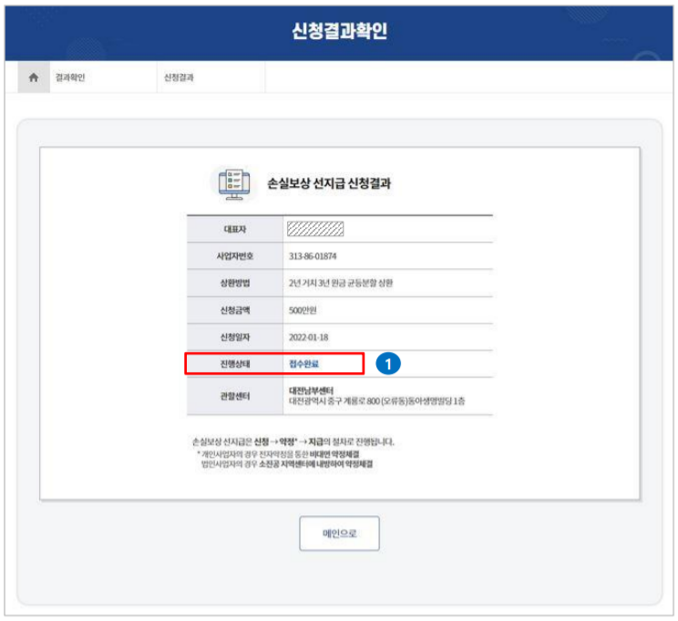 신청 완료된 최종 화면입니다. 진행상태에서 '접수 완료'라고 뜨는 것을 확인하실 수 있습니다. 만약 손실보상 선지급 신청 결과를 확인하고 싶으시다면 다시 처음 홈페이지 메인화면을 가야 합니다.