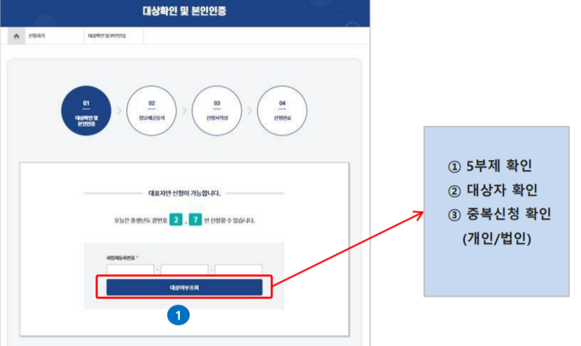 우선 5부제인지 확인하고 사업자등록번호를 입력한 후 대상 여부 조회를 누릅니다.
