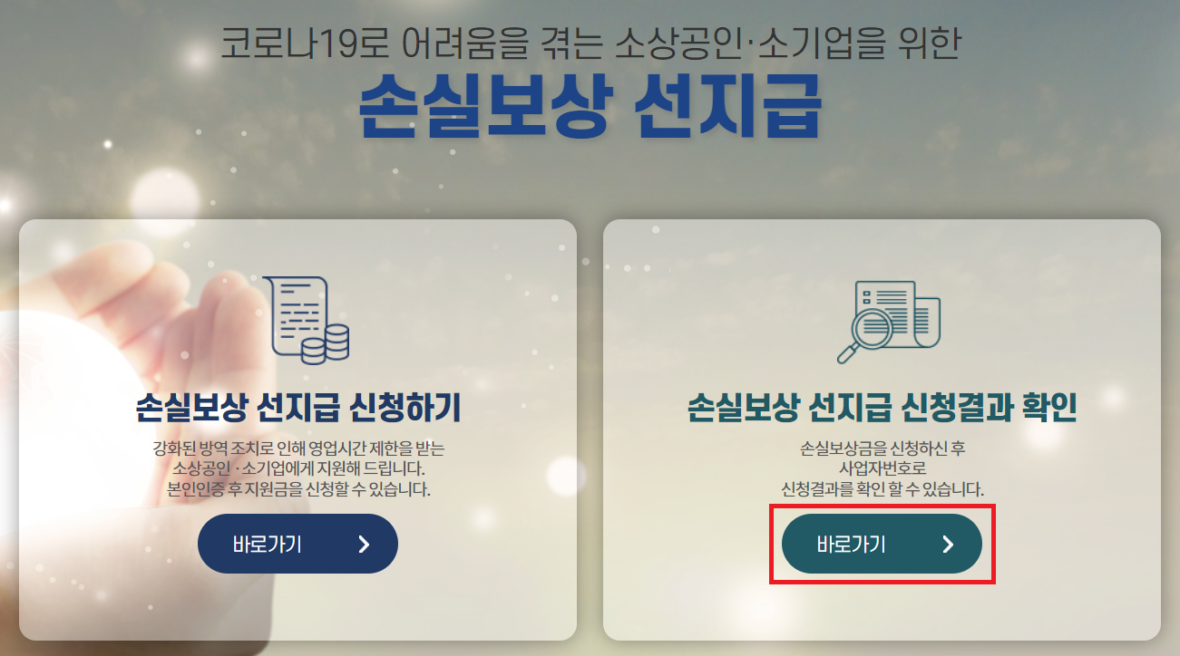 여기에서 오른쪽에 있는 '손실보상 선지급 신청결과 확인'에서 '바로가기'를 누릅니다.