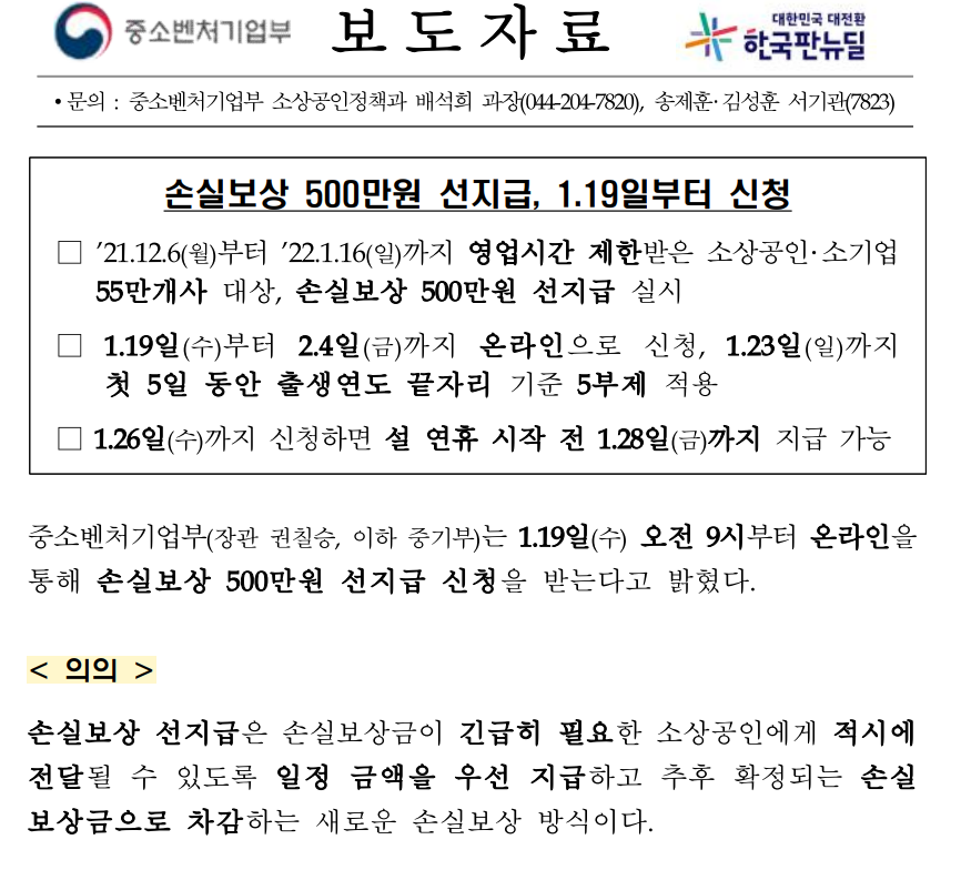 우선 손실보상 500만 원을 선지급하기로 발표를 했는데요. 위의 공고문을 통해서 알 수 있듯이 영업시간을 제한을 받은 소상공인과 소기업 55만 개 사가 대상이며 1월 19일 수요일부터 온라인으로 신청이 가능합니다.