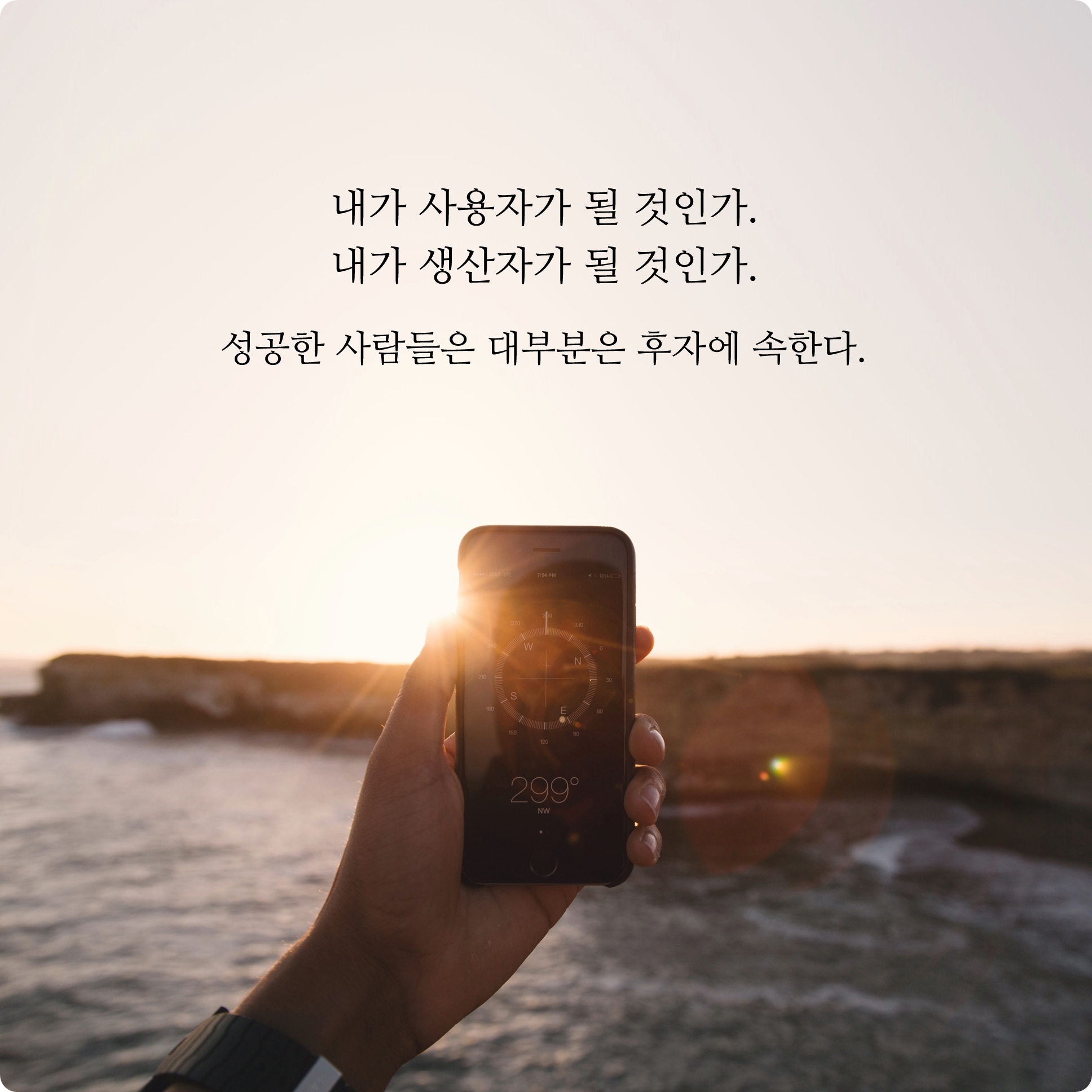 내가 어떤 서비스를 이용하거나 어떤 제품을 구입하거나 심지어 유튜브를 봤을때에도. 단순한 감상자나 사용자가 되시는 편이신가요? 아니면 무에서 유를 창조해내는 생산자 또는 크리에이터가 되시는 편이신가요? 성공한 사람들 대부분은 내가 사용자의 관점에서 무엇을 개발하고 연구하며 하나의 가치로 창출해내는 역할을 하고 있습니다. 사회는 이런 사람들이 이끌어 간답니다.