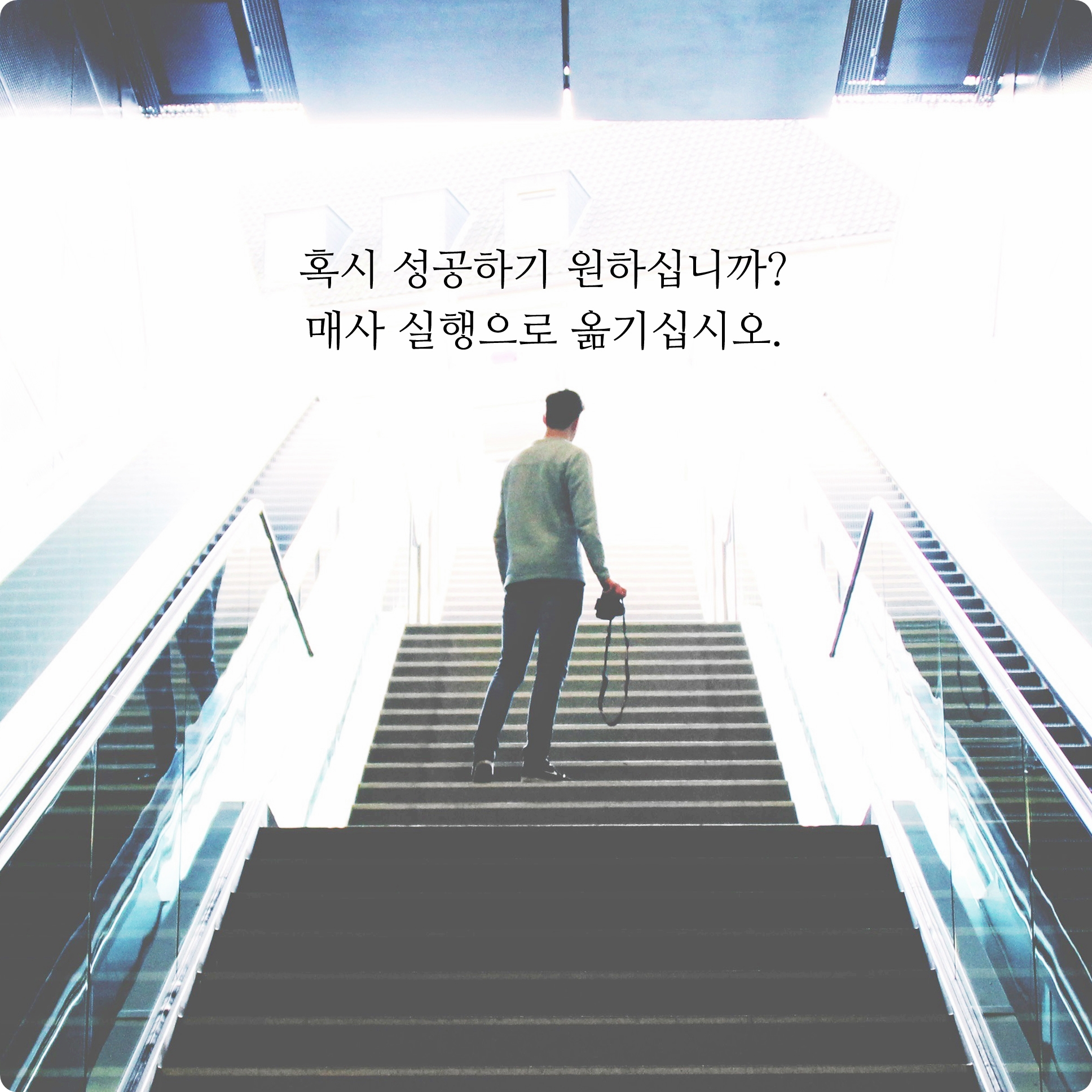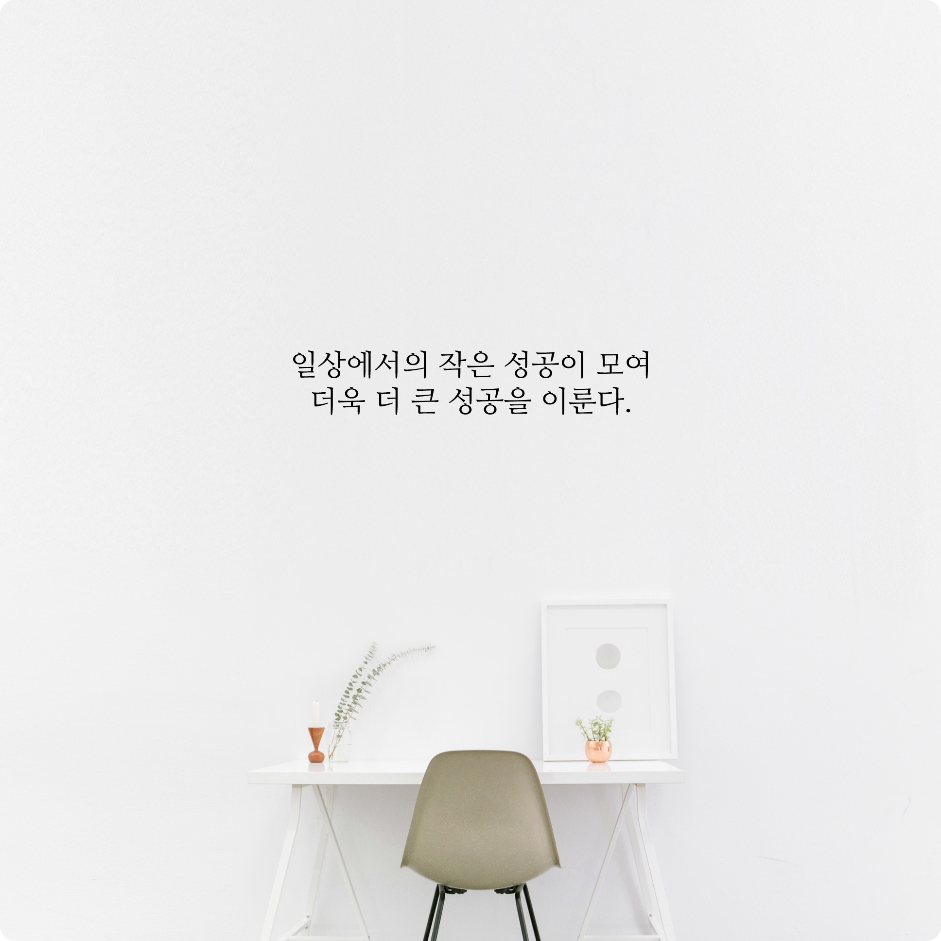 성공이라는 것이 크고 방대한 것을 위해 큰 마음을 먹고 달성하는 그런 거창한 것은 아니랍니다. 단지 일상에서부터 실천할 수 있는 수만가지의 작다한 성공들이 모여 이룩해내는 것이 훗날에 더 큰 성공으로 자연스럽게 이어지는 것이죠. 내가 양치질을 하거나 취미를 즐긴다거나 오늘 해야할 것에 대한 계획을 세우고 실천하며 끝내는 습관을 갖는 것만으로도 이미 하루에도 수십개 수백개의 성공을 이룰 수 있지 않을까요?