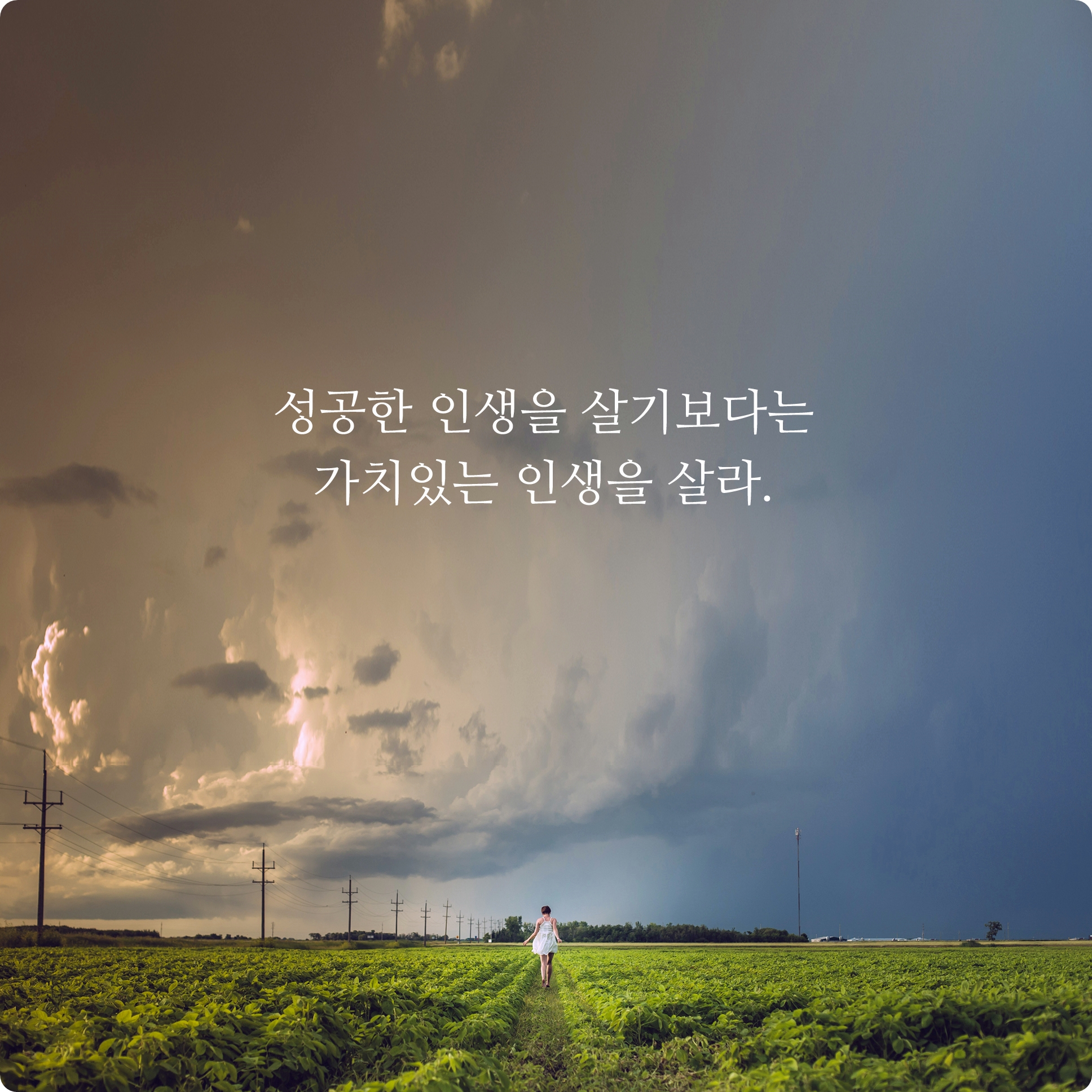 성공한 인생은 그다지 중요하지 않아요. 성공의 기준은 사람 개개의 생각마다 다를 수 있으며 정확한 '성공'에 대한 정의도 존재하지 않기 때문이죠. 좀 더 깊게 생각해보면 성공이라는 단어는 말 그대로 무엇인가를 이루어냈다는 단어일 뿐 그 인생의 목표가 될 수는 없습니다. 이런 막연한 성공보다는 내가 어떤 방향을 향해 어떤 삶을 살아야 하는지 그런 자기 자신만의 인생의 가치가 무엇인지를 아는 것이 더욱 더 중요합니다.