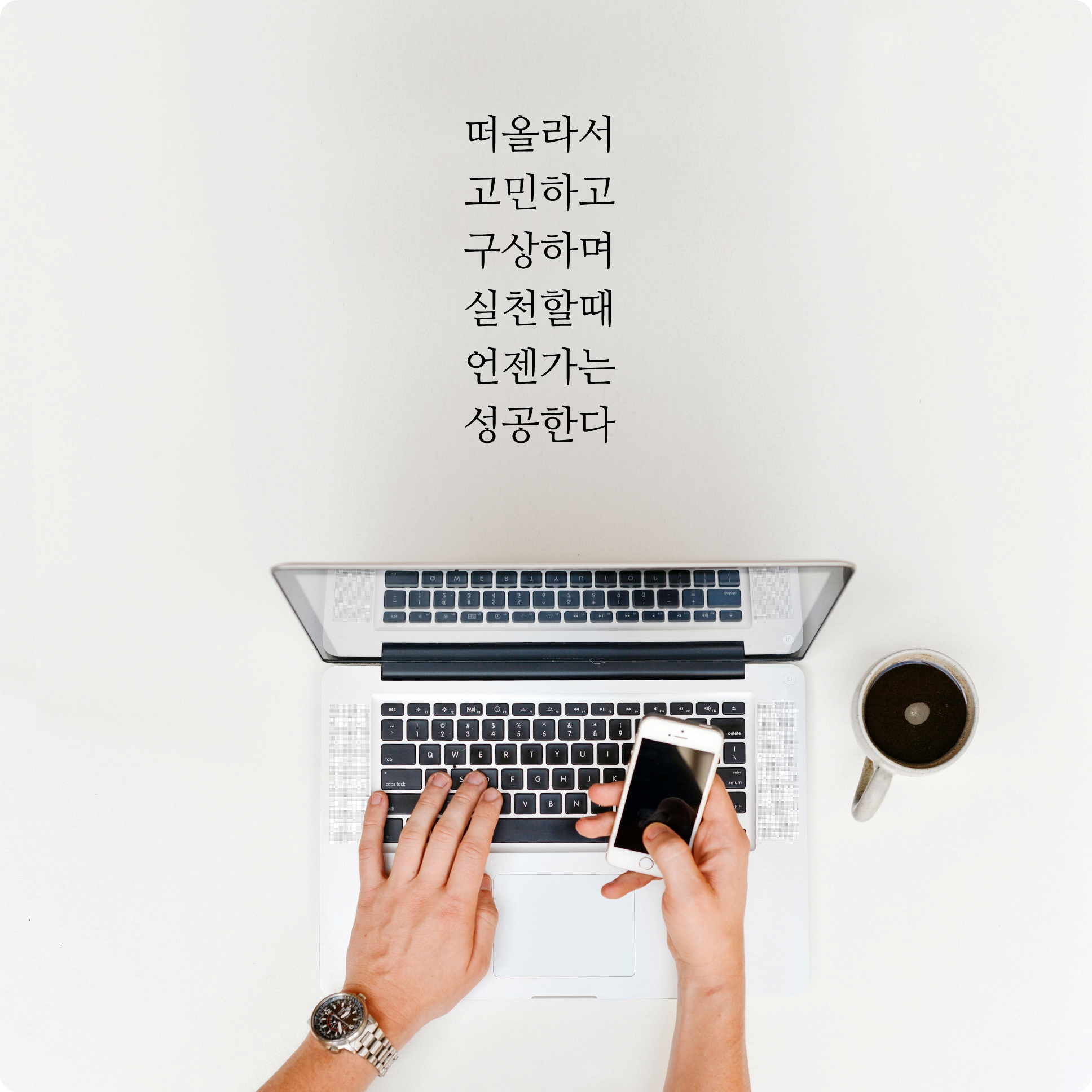 딱 4음절의 중요한 메세지들을 문단별로 나열한 글귀입니다. 억지스러운 은율이라고 생각하겠지만 제가 표현하고 싶은 메세지들이 이 문장들에 표현이 되어있습니다. 아이디어가 떠올랐을때 그냥 스쳐지나가는 생각이 되셨나요? 그 떠오른 생각들에 대해서 진지하며 제대로된 고민을 해본 적이 있나요? 혹시 이렇게 하면 어떨까. 내가 사용자라면 어떤게 나을까? 라고 구상을 해봤나요? 혹시 그 생각을 실천으로 옮겨봤나요? 그 생각이 떠올랐고 당차게 실패로 끝났어도 언젠가는 반드시 성공할 것이랍니다. 시간차이일 뿐이죠.