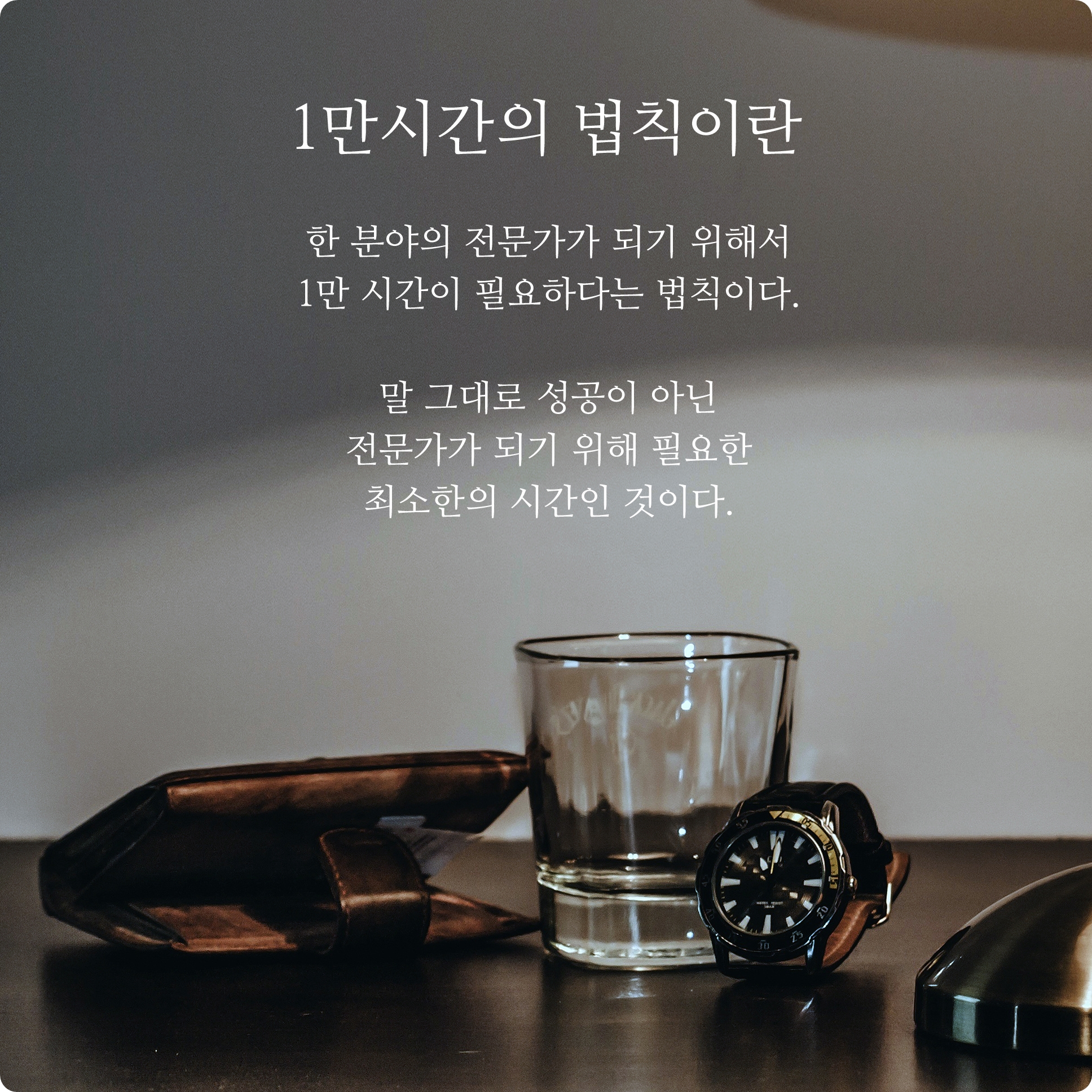 성공 아니 전문가가 되기 위해서는 최소 1만여 시간이 필요하다고 하는데요. 그만큼 오랜 시간동안 지속적으로 연습과 훈련을 통해서 끊임없이 노력하는 것을 말한답니다. 이 1만 시간은 하루를 3시간씩 투자한다고 했을때에는 약 10년정도가 걸리는 시간이고 하루 10시간씩 투자를 하게 될 경우에는 대략 3년여의 시간이 걸리는 기간이라고 하네요. 그만큼 상당한 노력과 개발과정이 필요한 것이죠. 그래야만 그 분야에서 전문가라는 인정을 받을 수 있다고 합니다. 성공이 아닌 단순한 전문가를 말하죠.