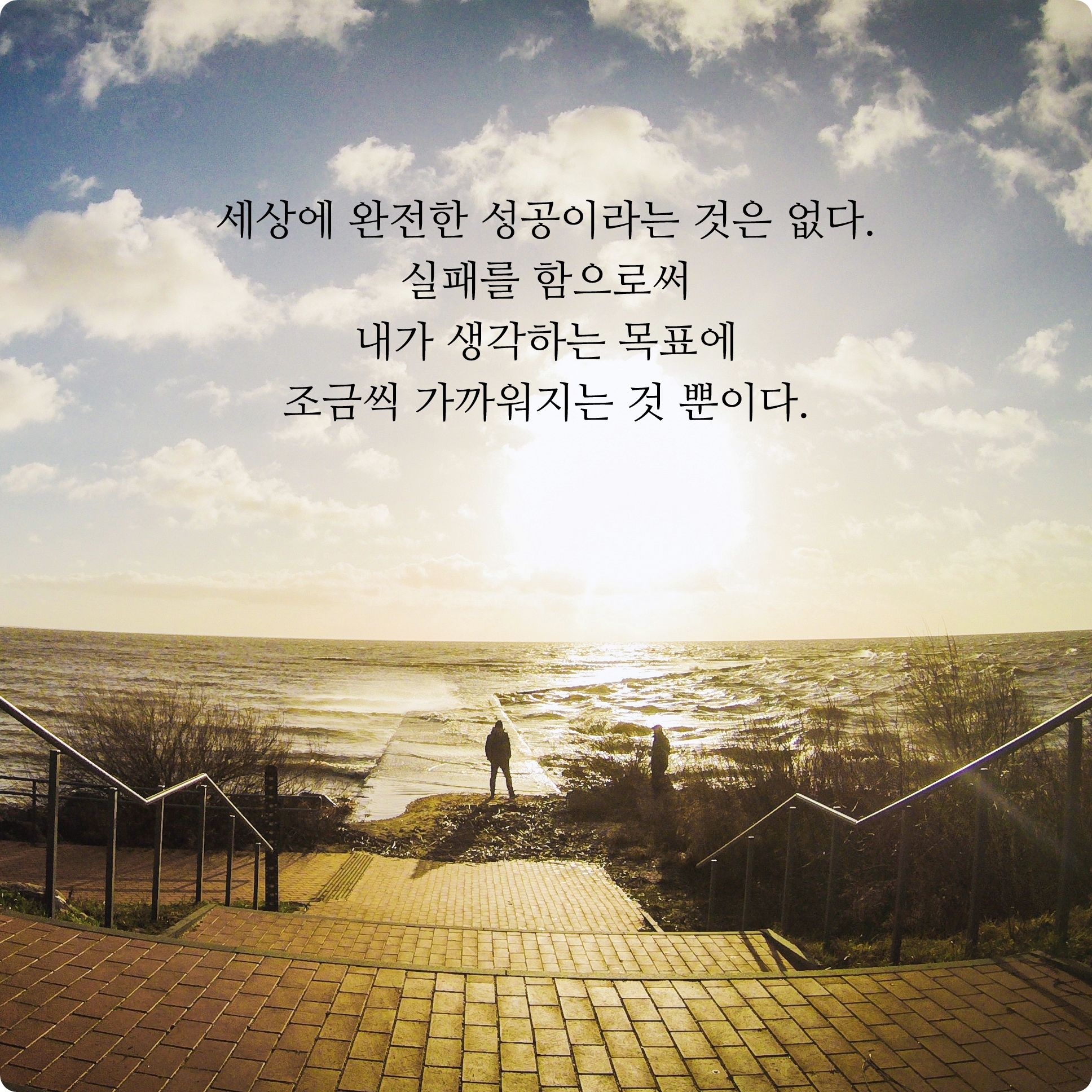 마찬가지로 완전하면서도 완벽한 성공도 존재할 수 없습니다. 실패를 경험하고 내가 추구하고자 하는 목표를 향해 한단계 한단계씩 나아가는 것이 조금씩 성공에 근접할 수 있습니다. 달성을 했다고 해서 뭔가 마침표를 찍는것은 아니랍니다. 끊임없이 내가 원하는 방향을 향해 앞으로 조금씩 나아가는 것이 참된 인생이 아닐까요.