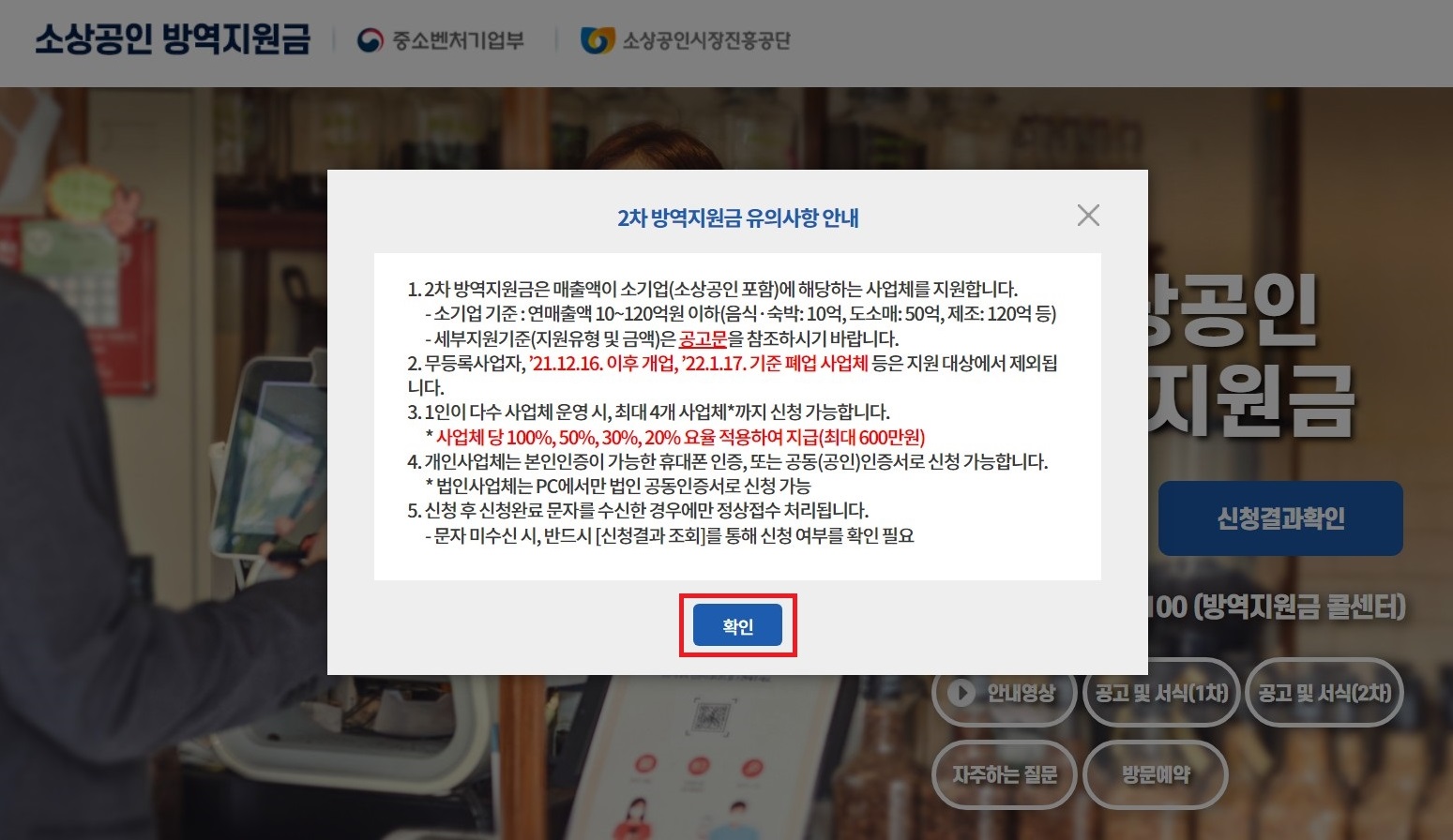 그런 다음 최종 신청 접수가 완료된 화면을 확인한 뒤 확인을 누르면 처음에 방문했었던 소상공인 방역지원금 2차 신청 홈페이지 메인화면으로 이동됩니다.