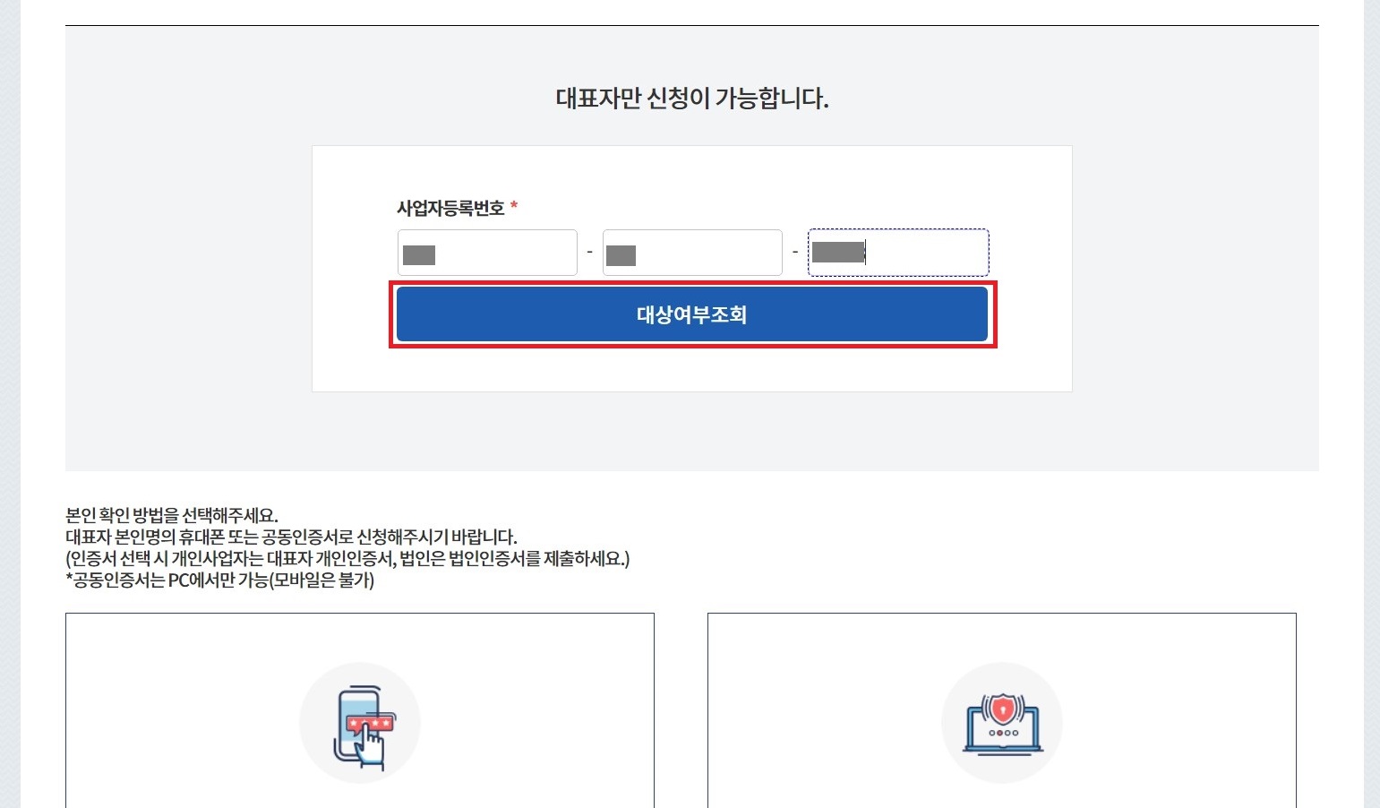 우선 사업자등록번호를 입력하여 대상 여부 조회를 눌러 신청 대상인지를 확인한 다음 아래 본인인증을 진행하시면 됩니다.