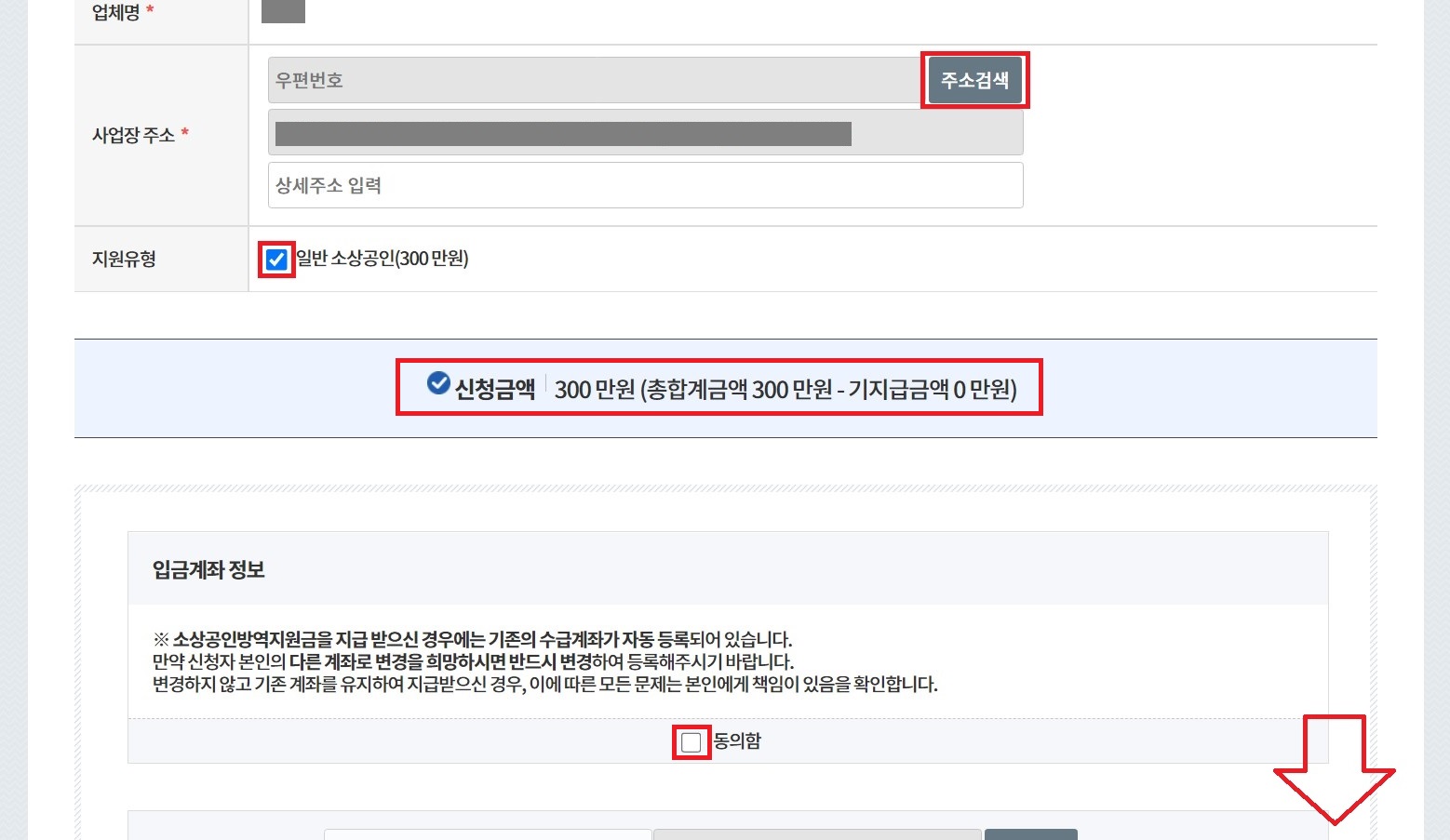 업체명과 사업장 주소를 입력하시고 지원 유형을 한 번 더 확인 및 체크하시면 되시며, 입금계좌 정보에 동의함을 눌러 스크롤을 내리시면 됩니다.
