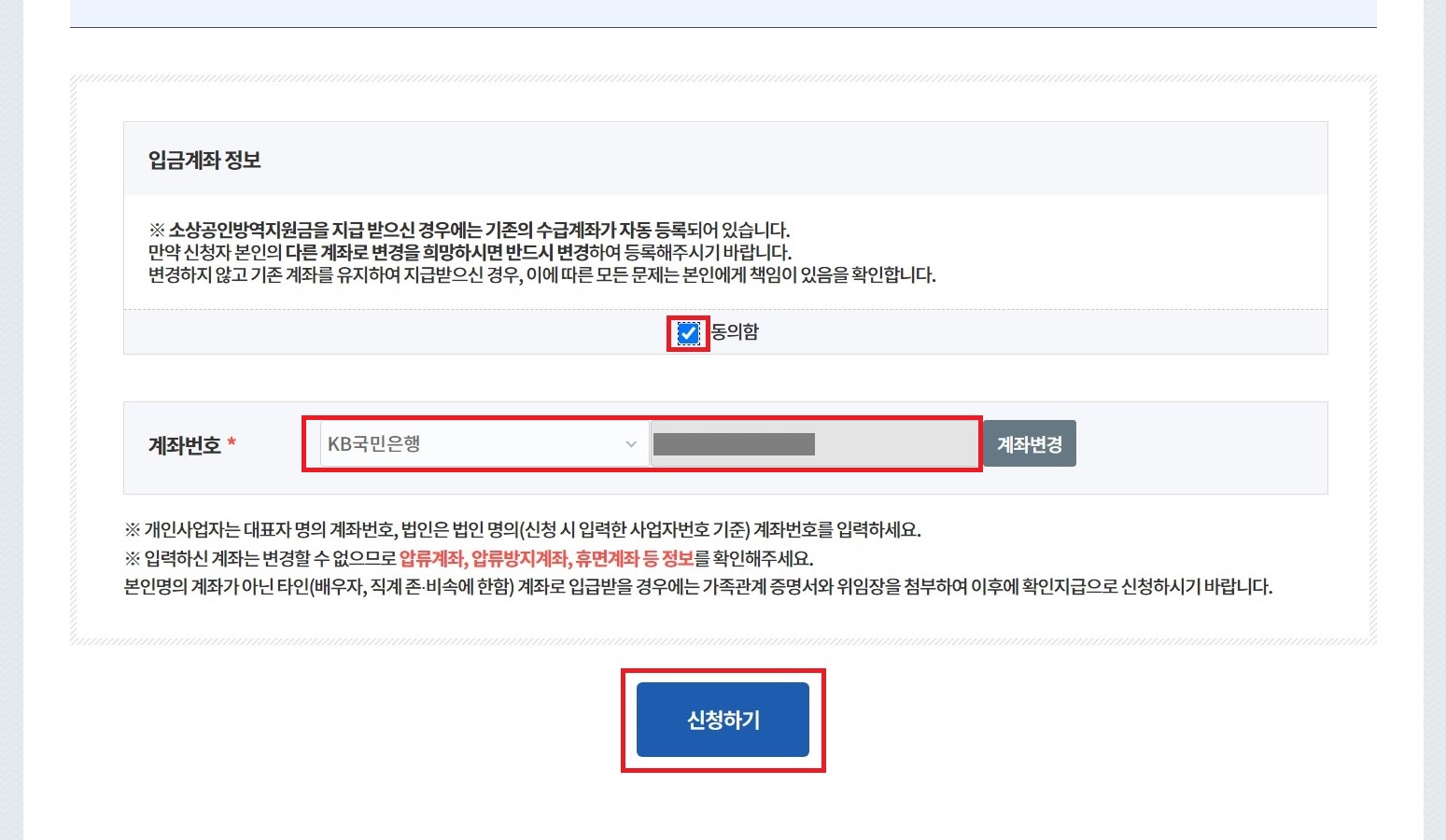 지급될 계좌를 확인합니다. 입력되어 있는 또는 새로 변경해야 할 계좌를 확인 및 변경하시면 됩니다.