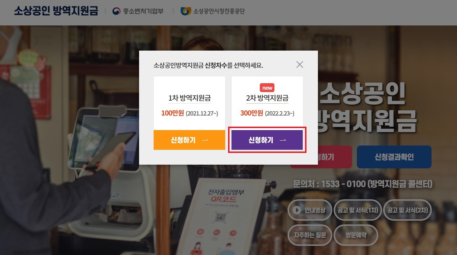이번 오른쪽에 있는 2차 방역지원금 300만원 [신청하기] 탭을 눌러 신청을 진행하시면 됩니다.