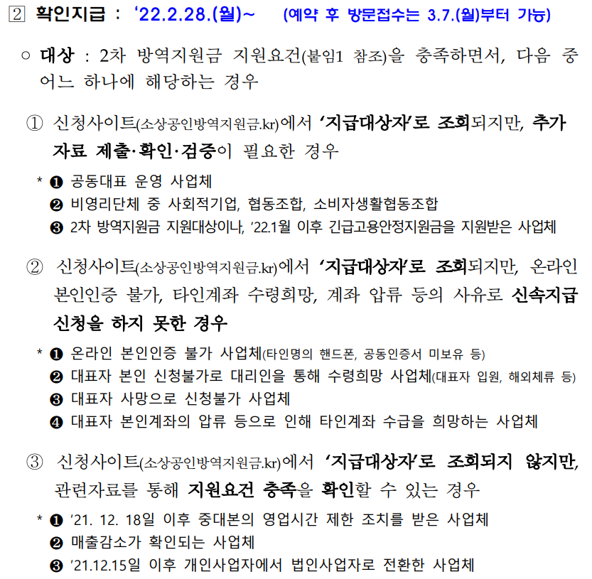 신속 지급 대상에서 제외되어 확인 지급 기간에 신청하시는 분들은 2022년 2월 28일 월요일부터 신청이 가능하며 위의 공고 내용처럼 지원 대상과 신청 사이트, 지원 요건 등을 한 번 더 숙지하시고 신청하시길 바랍니다. 코로나19로 인해서 좌절에 빠지신 분들 모두 관련 정보들을 잘 숙지하셔서 어려움에 놓인 사업장에 도움이 되었으면 좋겠습니다. 모두 힘내시고 파이팅하시길 바랍니다.