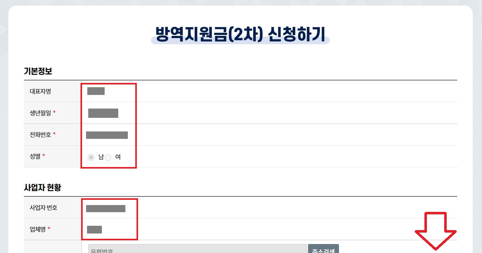 방역지원금 2차 신청 및 입력하는 화면이 나오며, 대표자명과 생년월일, 전화번호, 성별 등을 입력 및 체크한 후 사업자번호와 업체명을 확인한 뒤 스크롤을 내립니다.