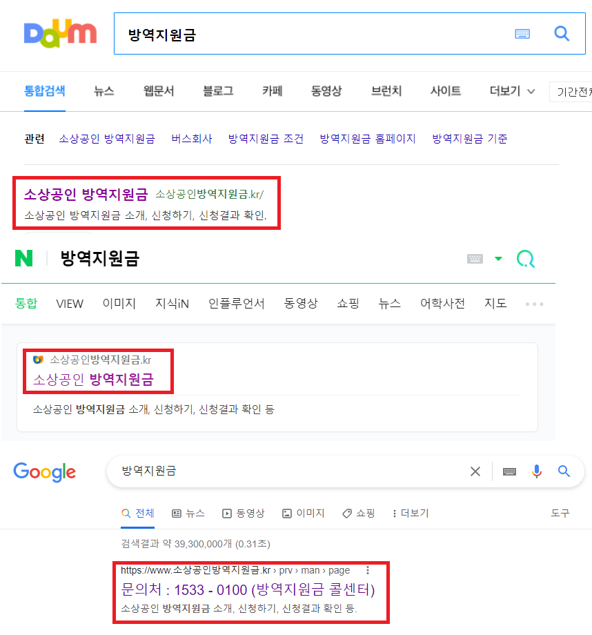 각 포털 사이트에 검색했을때의 화면입니다. 다음, 네이버, 구글 모두 '방역지원금'이라고 검색하시면 이번 2차 300만 원에 지급에 해당이 되는 신청 홈페이지로 방문하실 수 있습니다.