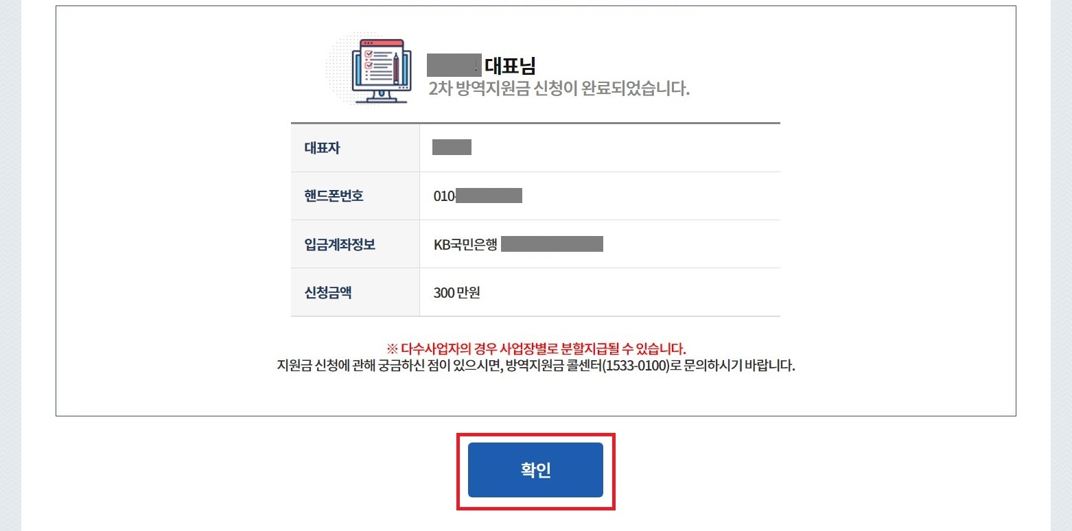 신청금액과 사업자번호, 그리고 지급될 계좌를 확인한 뒤 확인을 누릅니다.