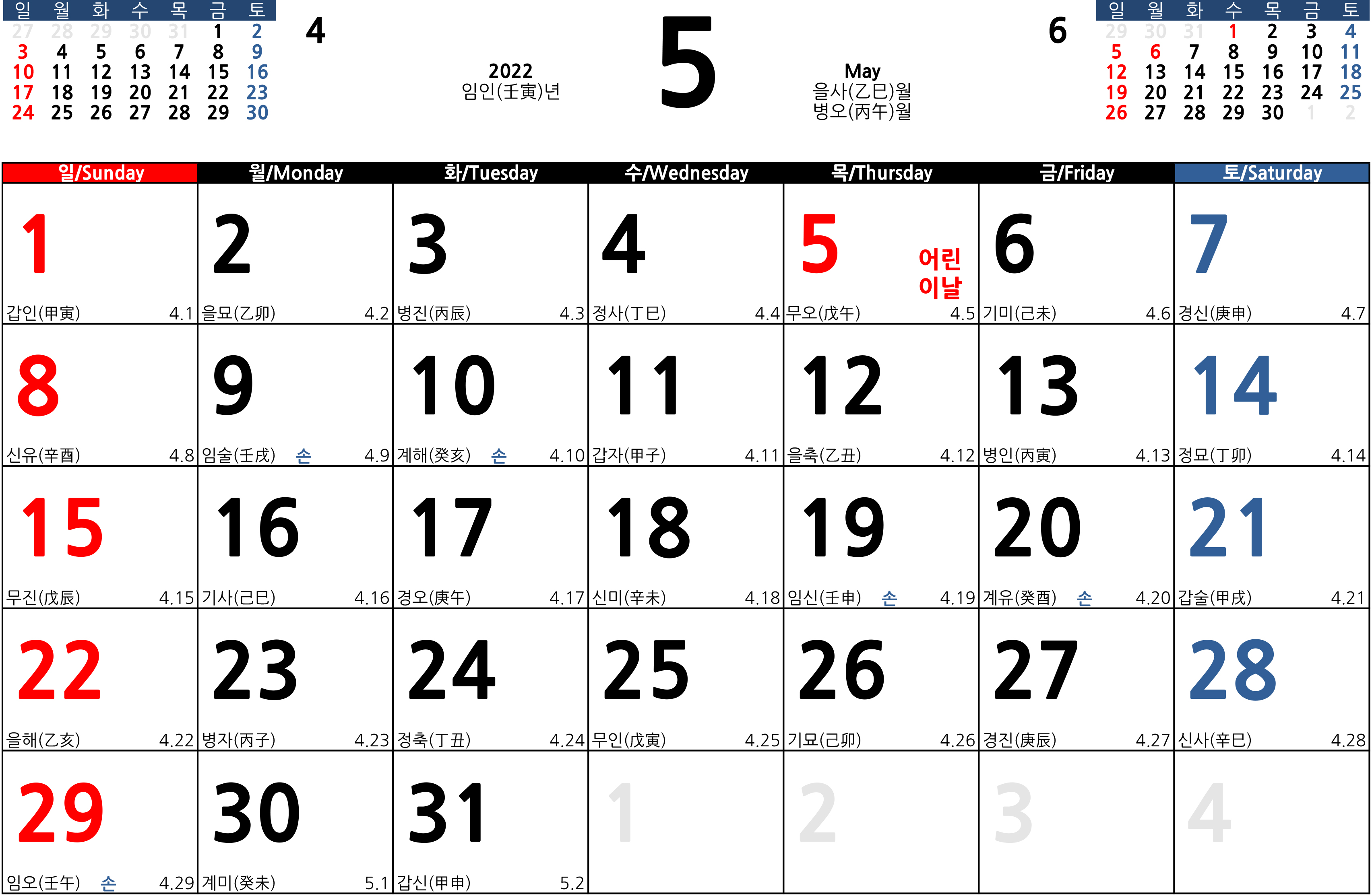 2022년 5월 달력 프린트하기 적합한 엑셀 xlsx 파일과 한글 hwp 파일로 무료 다운로드 가능하도록 원본으로 첨부했습니다.