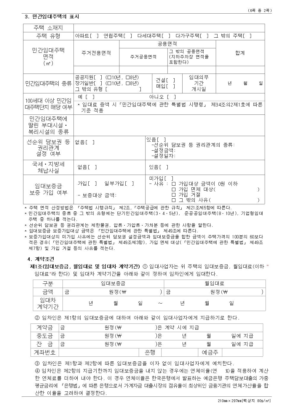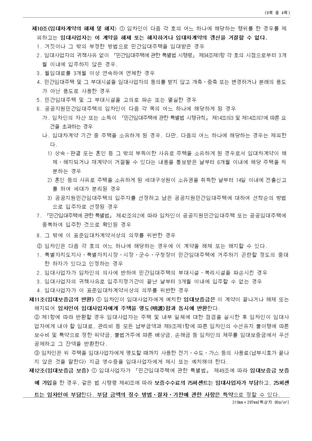 시군구청에 등록이 된 경우에는 주택임대 사업자로 등록된 사람은 '표준임대차계약서'를 사용하여야 하는데요. 계약일로부터 신고 의무기간 3개월 내로 임대 물건지가 속한 관할 시청, 군청, 구청 등에 표준임대차계약서 사본과 구비서류를 지참한 다음 주택임대사업자 등록과 신고를 하시면 됩니다. 이에 해당되는 총 6쪽으로 구성된 계약서이며, 각 이미지를 살펴보면서 계약서 서식에 관한 부연설명 해드리도록 하겠습니다.