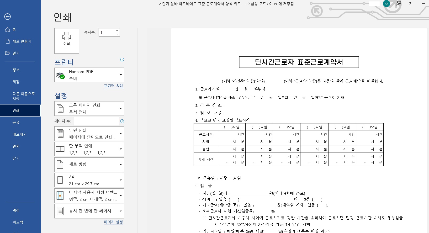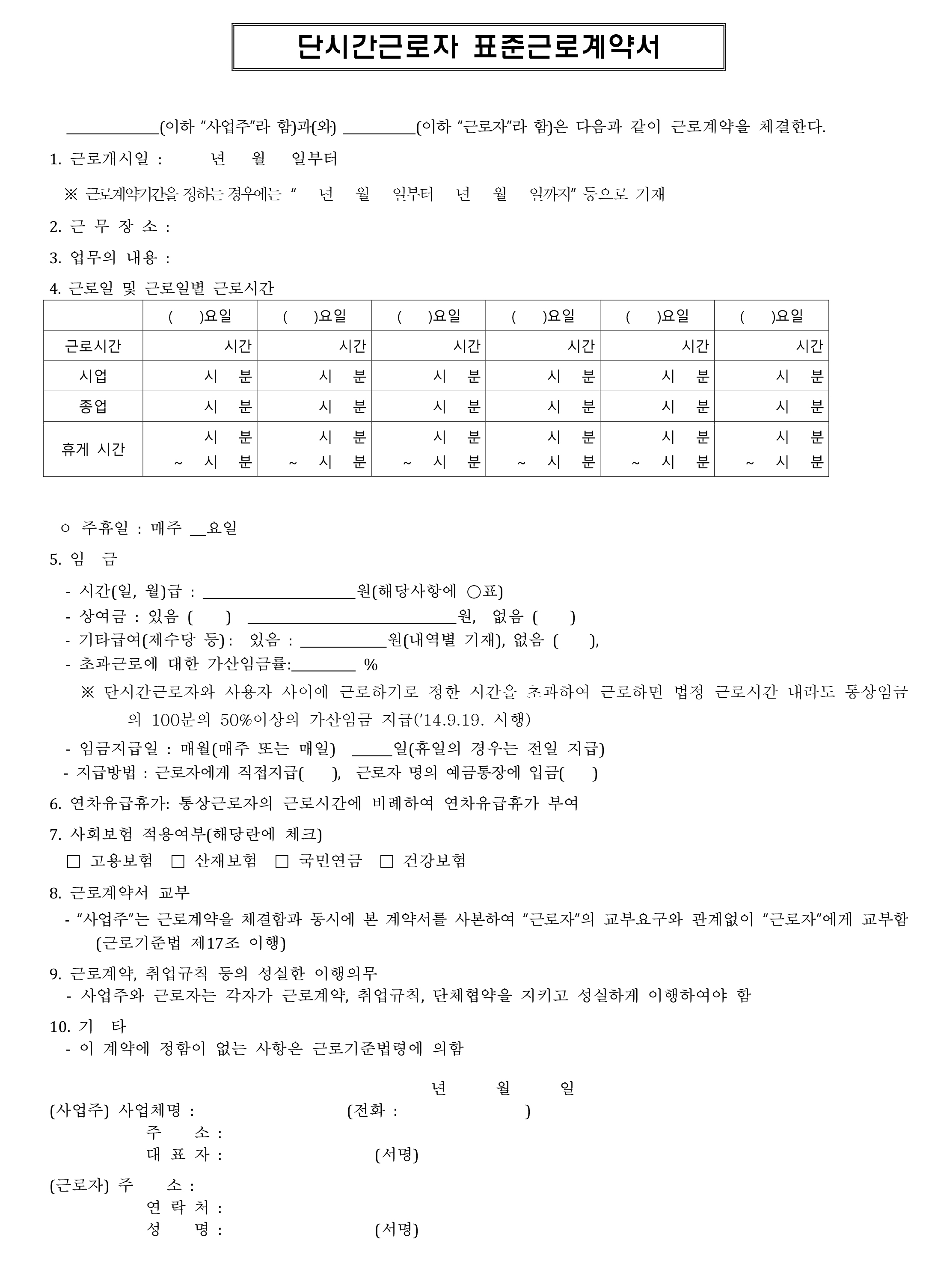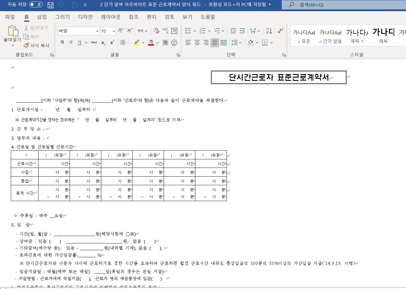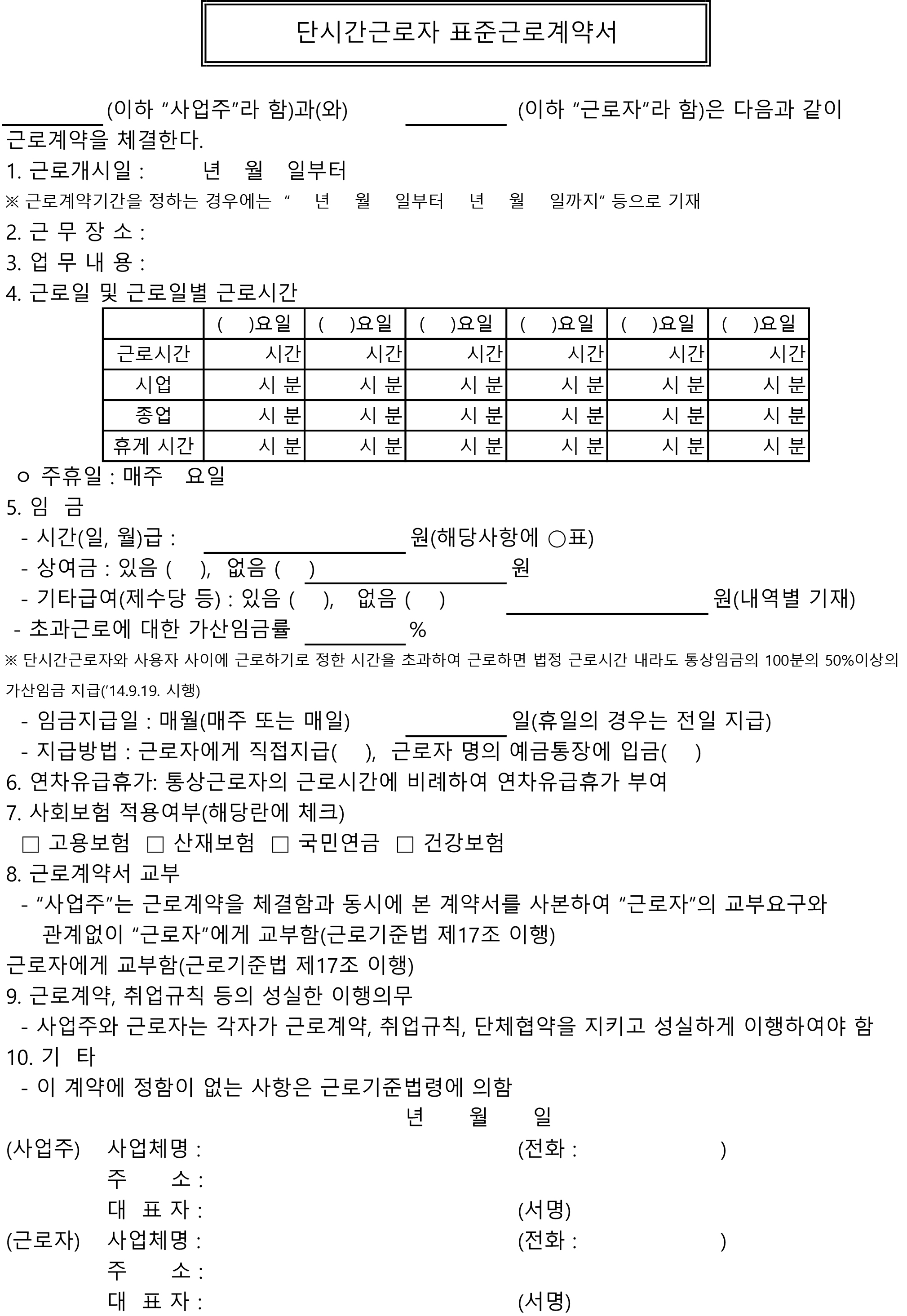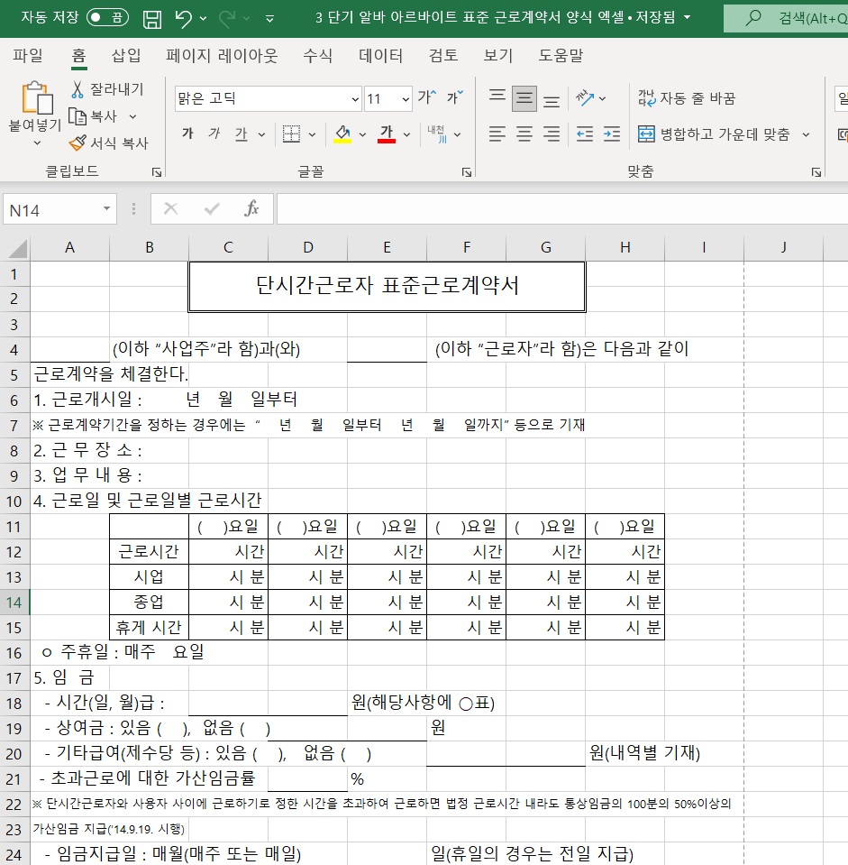 우선 해당 자료는 고용노동부 홈페이지 내에 있는 정책자료실에 고지된 근로계약서 양식이며, 등록일이 2019년 7월 1일이 최신 본이기 때문에 2022년 2023년 자료라 생각하시면 될 듯합니다. 총 7종 중에서 단시간 근로자 표준 근로계약서이며 우선 한글, 워드, 엑셀 순으로 재편집 후 업로드하였습니다.