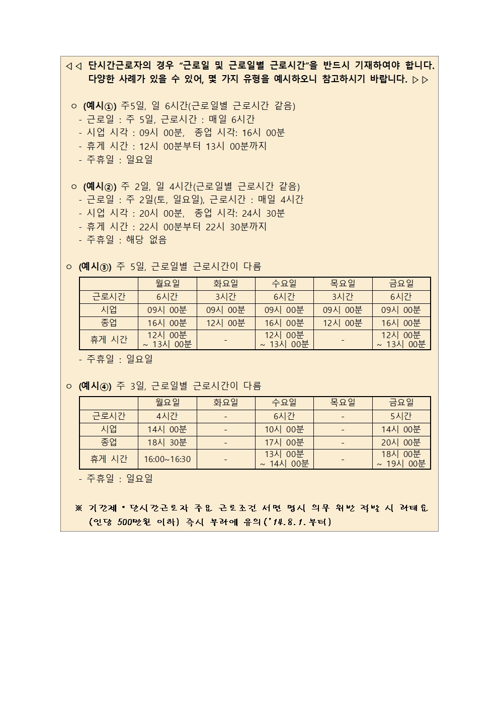 또한 하단에는 근로일과 근로시간, 휴게시간, 주휴일 등에 대한 표기 예시가 별지로 있기 때문에 각 예시를 살펴보면서 해당되는 날짜와 시간을 표기하실 때 참고하시면 됩니다. 한글 파일 다운로드는 위에 두 가지 중 첫 번째 첨부된 '1단기 알바 아르바이트 표준 근로계약서 한글.hwp' 파일을 저장하시면 되고 두 번째가 pdf 파일입니다.