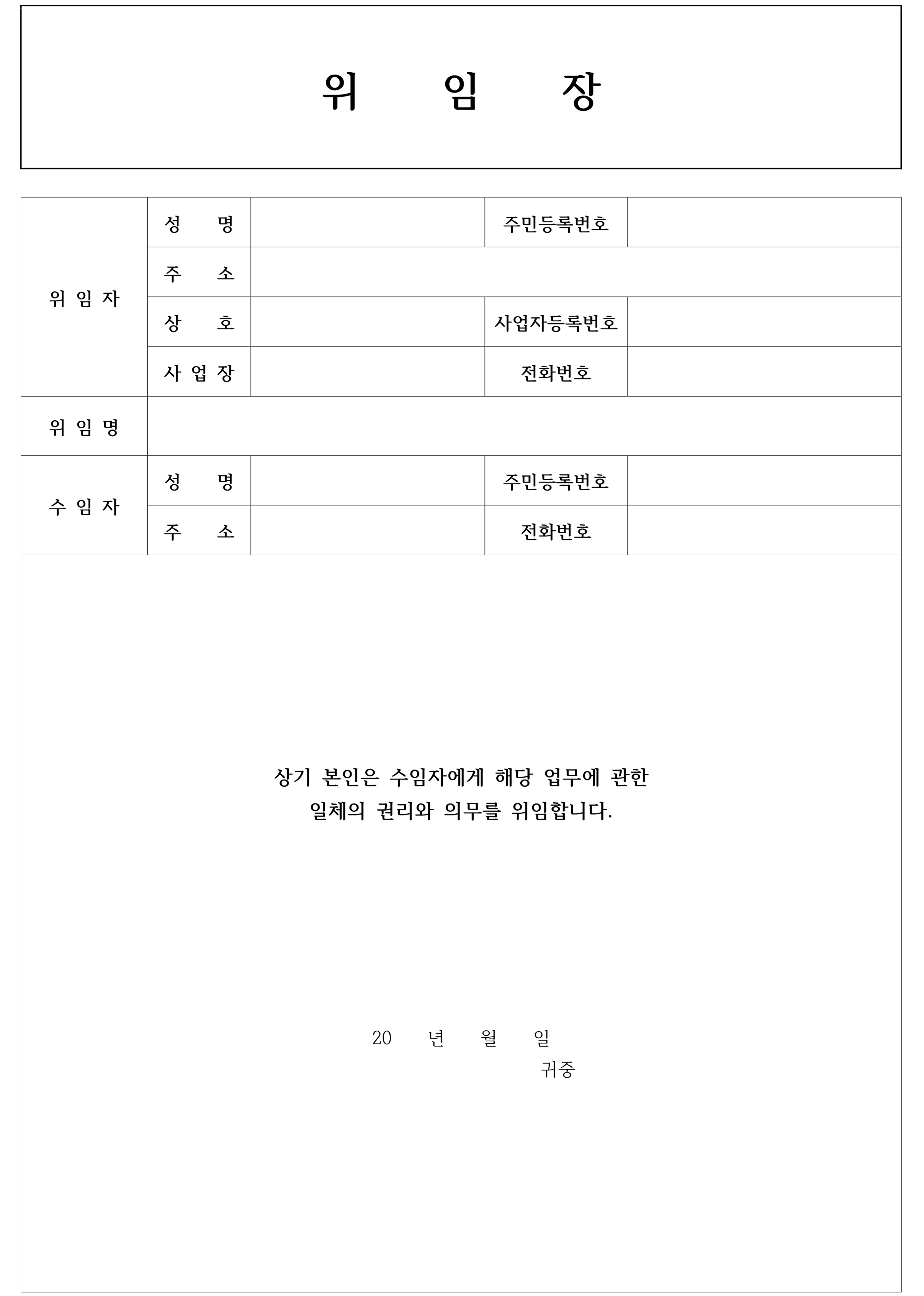 위임자와 수임자의 기본적인 인적사항이 각각의 칸으로 되어있고 위임사항에 대한 조항 문구가 심플하게 기재할 수 있는 구성입니다.