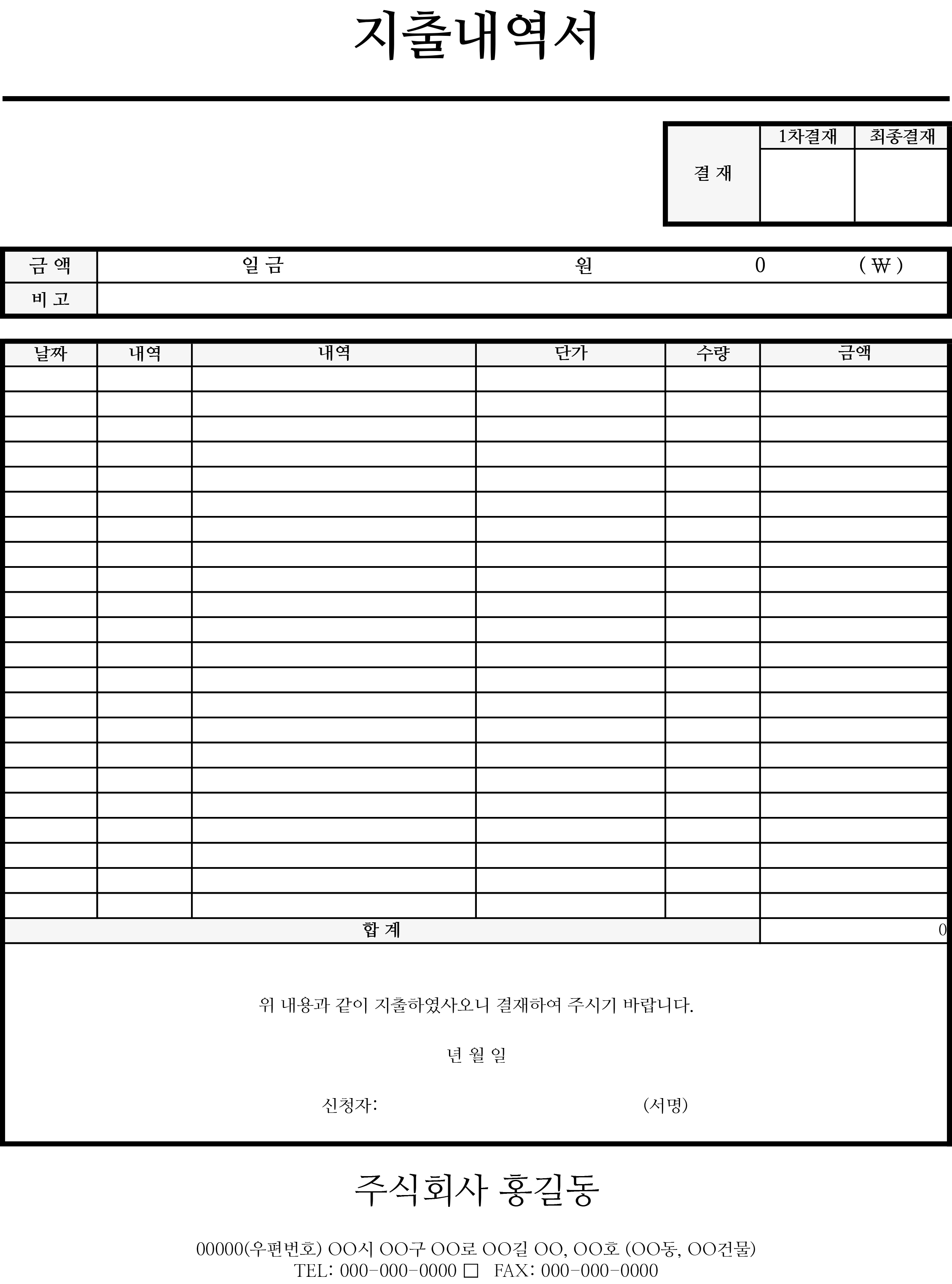 두번째 서식은 기존에 양식에서 서식과 구조를 조금만 바꾸었습니다. 도장이나 사인을 기재하는 결제 란 옆에 작성한 날짜와 지출날짜, 비고, 지출합계 칸을 별도로 만들었습니다.