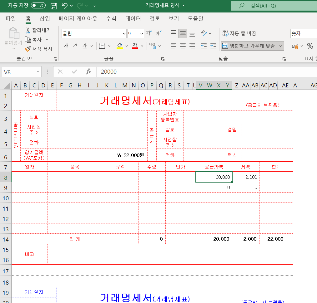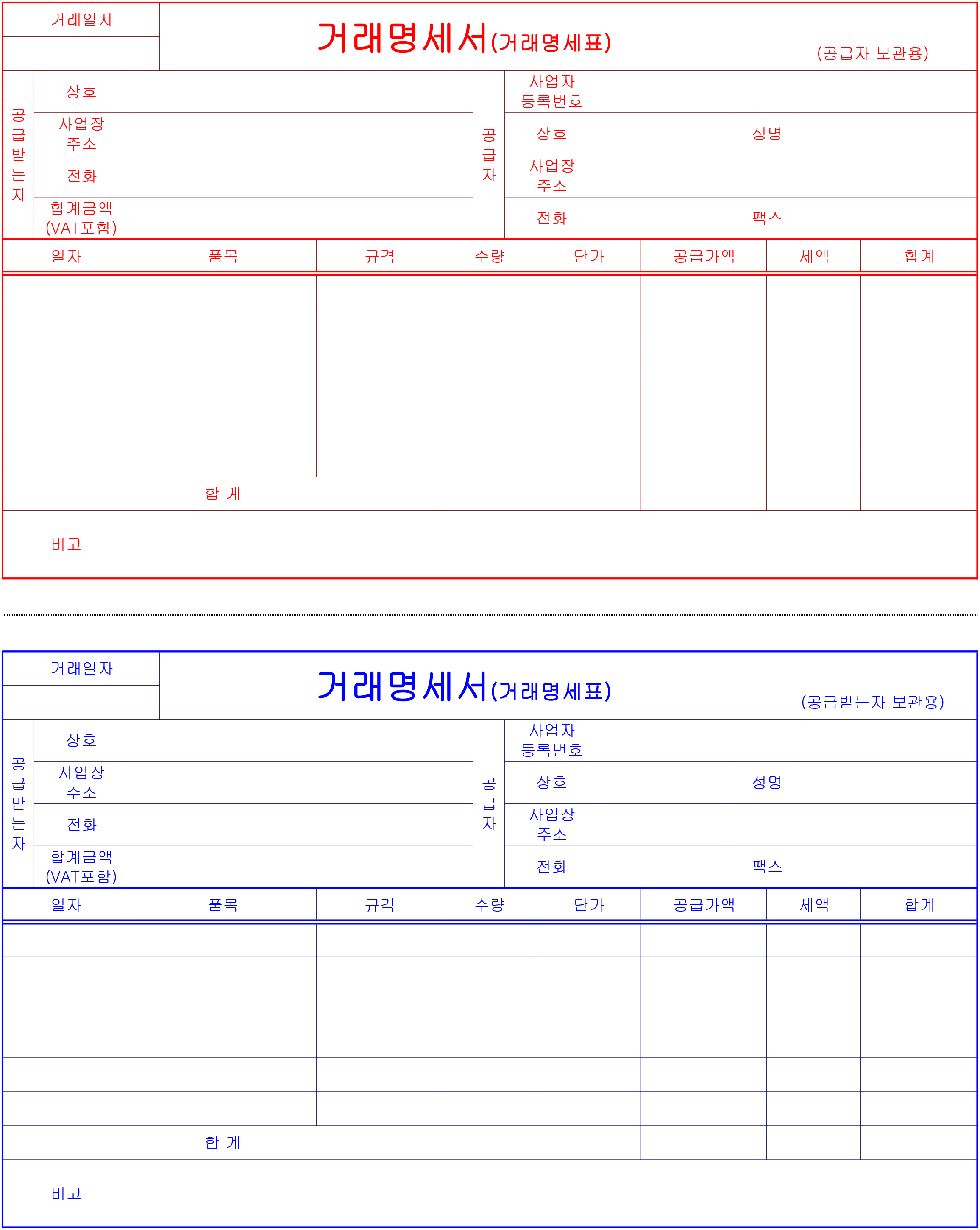 빨간색의 공급자 보관용에 기재를 하면 아래에 있는 파란색의 거래명세표 양식 또한 동일하게 기재가 됩니다.