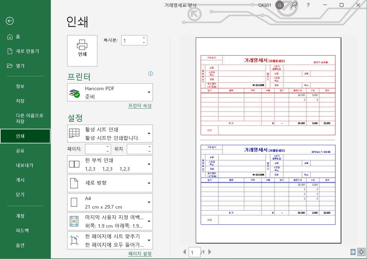 입력이 끝나면 인쇄하기 전 미리보기를 통해서 잘 입력이 되었는지 짤린 부분은 없는지 체크하시면 됩니다. 이렇게 첨부된 파일을 열어서 입력하는 화면의 모습을 살펴봤고요. 아래 각각 이미지 원본과 엑셀 xls 파일을 각각 첨부했으며 총 3개의 거래내역서 서식을 순서대로 나열했습니다.