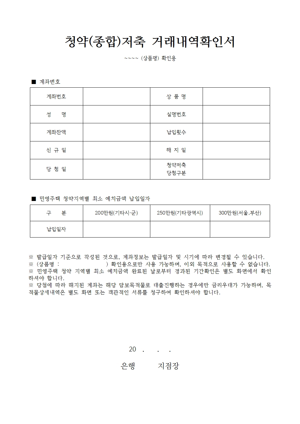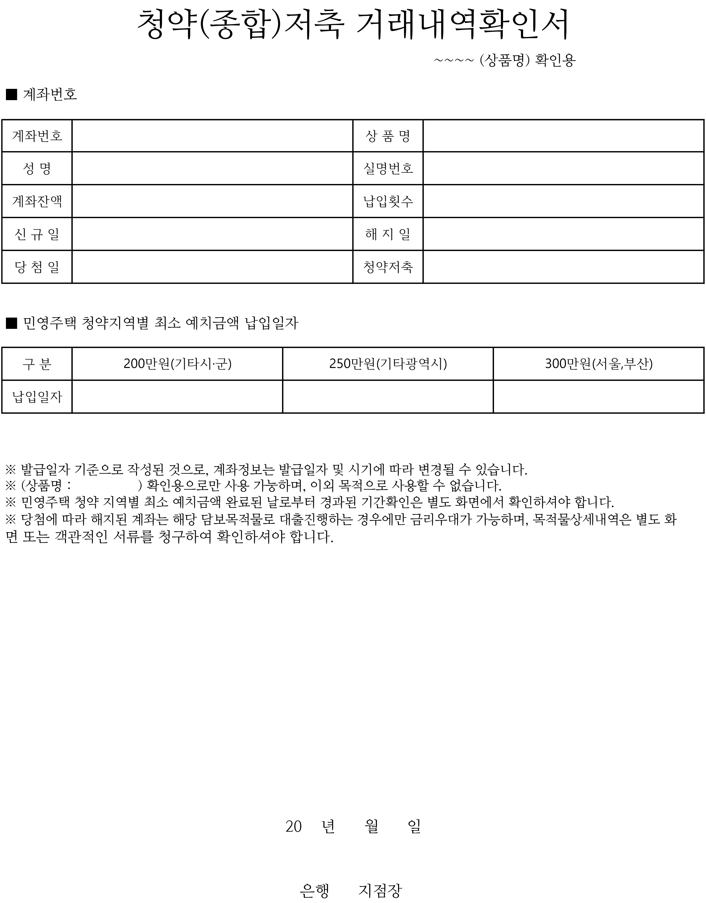청약저축 거래내역확인서입니다. 금융 상품, 청약 저축 상품에 따라 문구를 수정해주셔야 합니다.