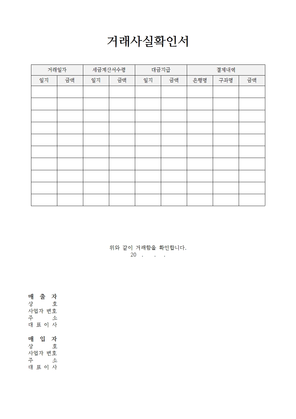 마지막 엑셀 거래내역확인서 양식입니다. 그리고 아래 2번 파일부터는 다른 서식과 구성으로 된 파일이니 이미지를 보고 다운로드에 참고하시면 됩니다.