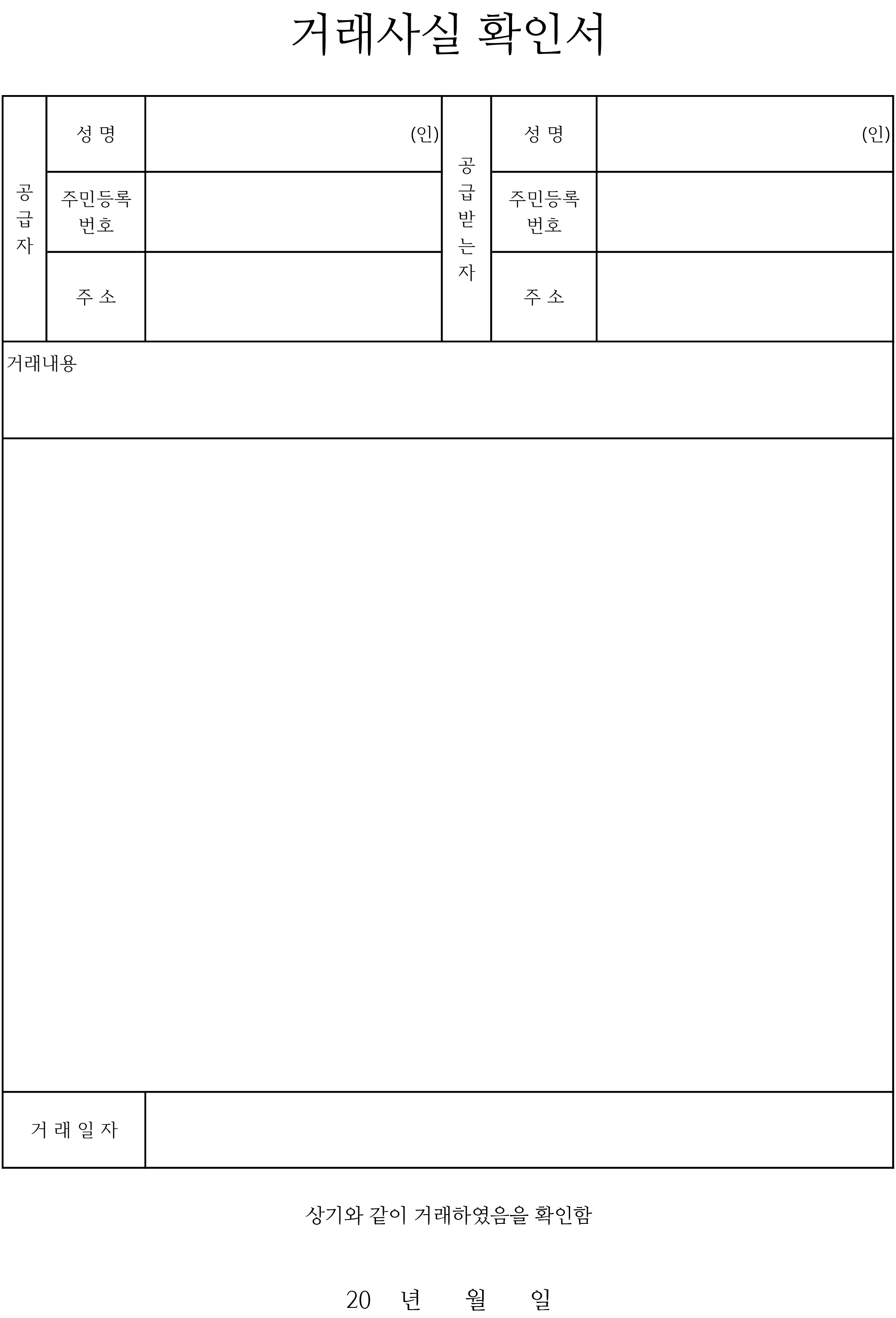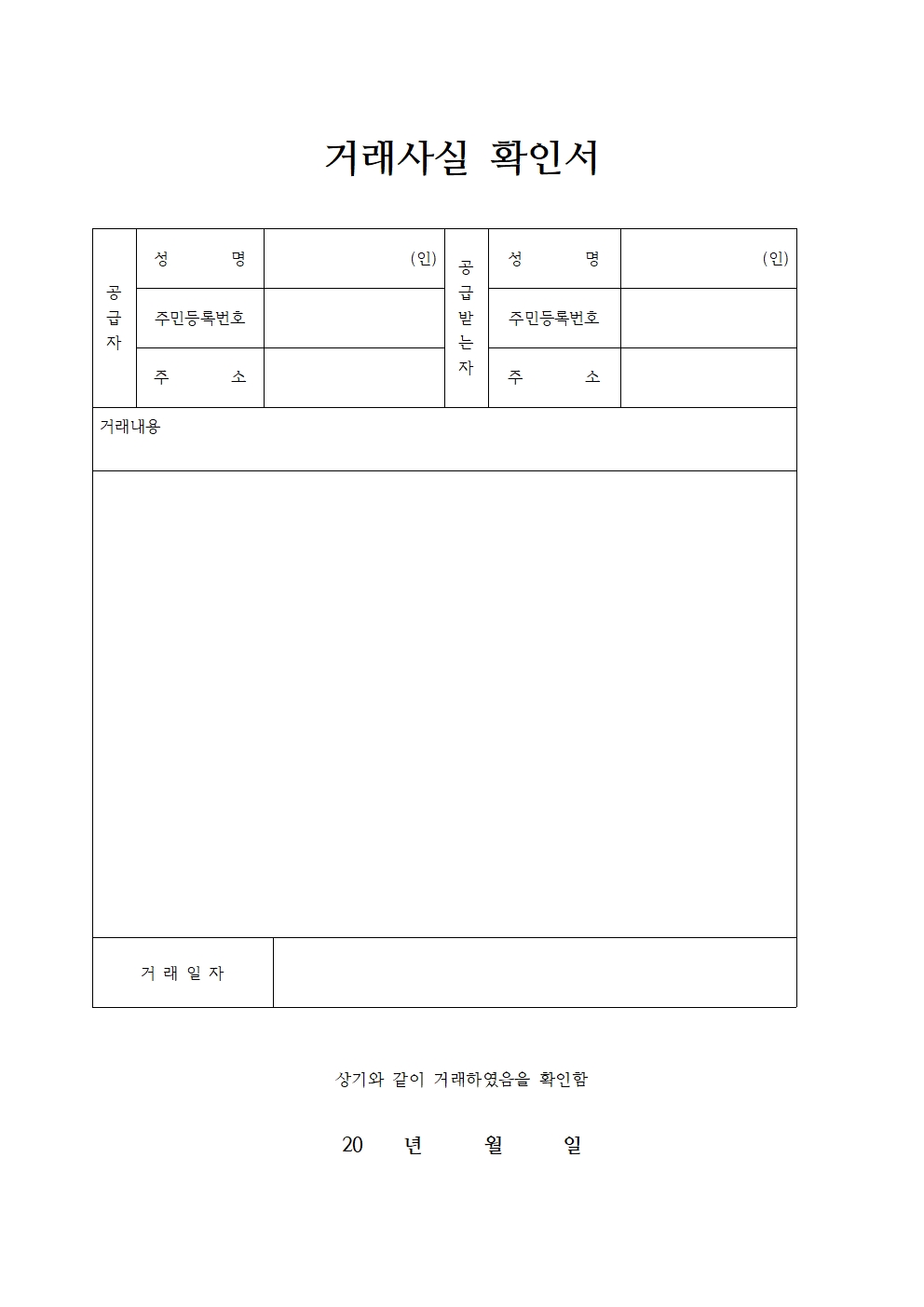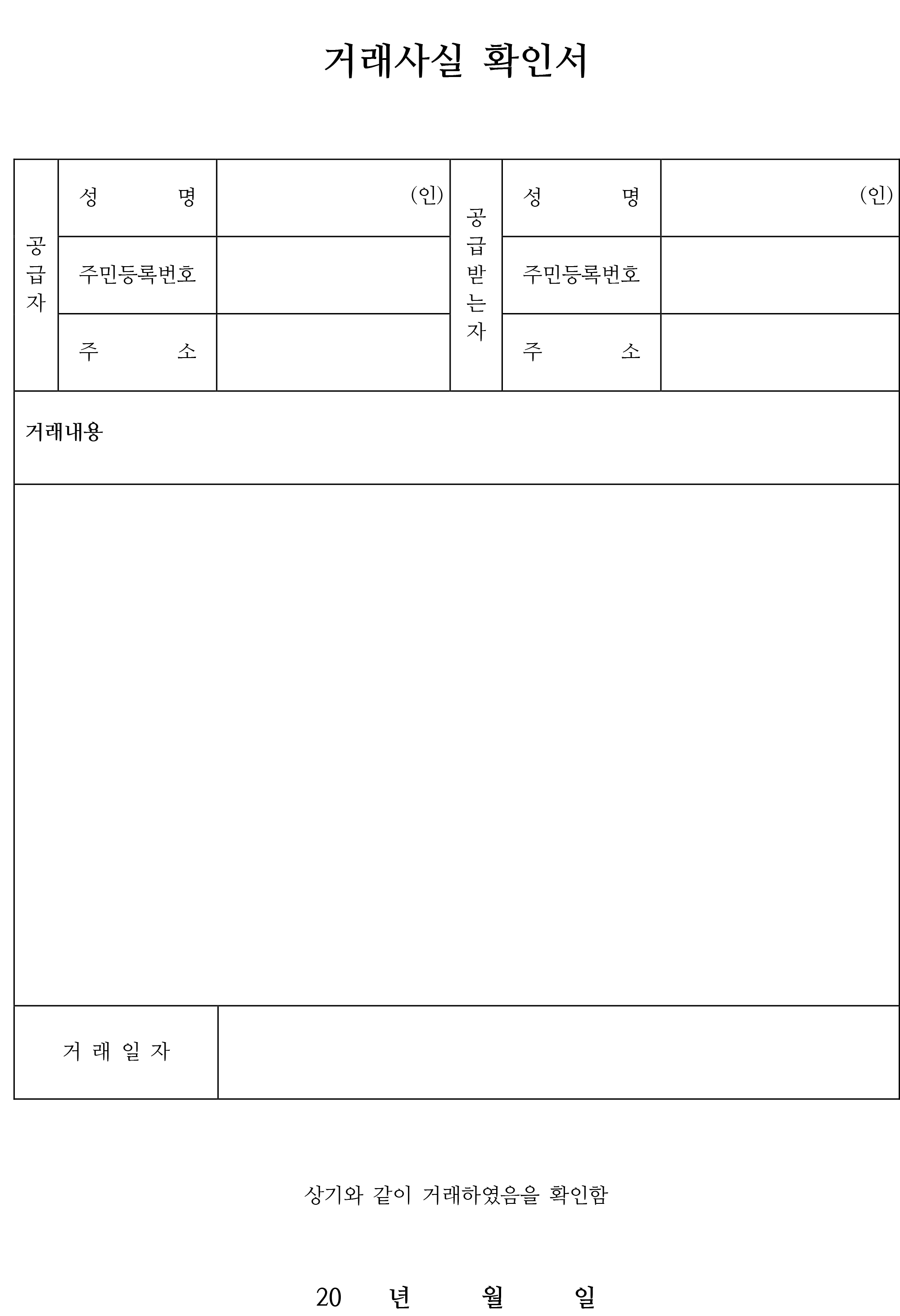 일반적인 거래사실 확인서 양식입니다. 공급자와 공급받는자 성명, 주민번호, 주소가 각각 기재되었으며 거래내용 부분에 간단한 거래내용을 기재하시고 별도의 칸에 상세 내역을 자유롭게 작성할 수 있습니다.