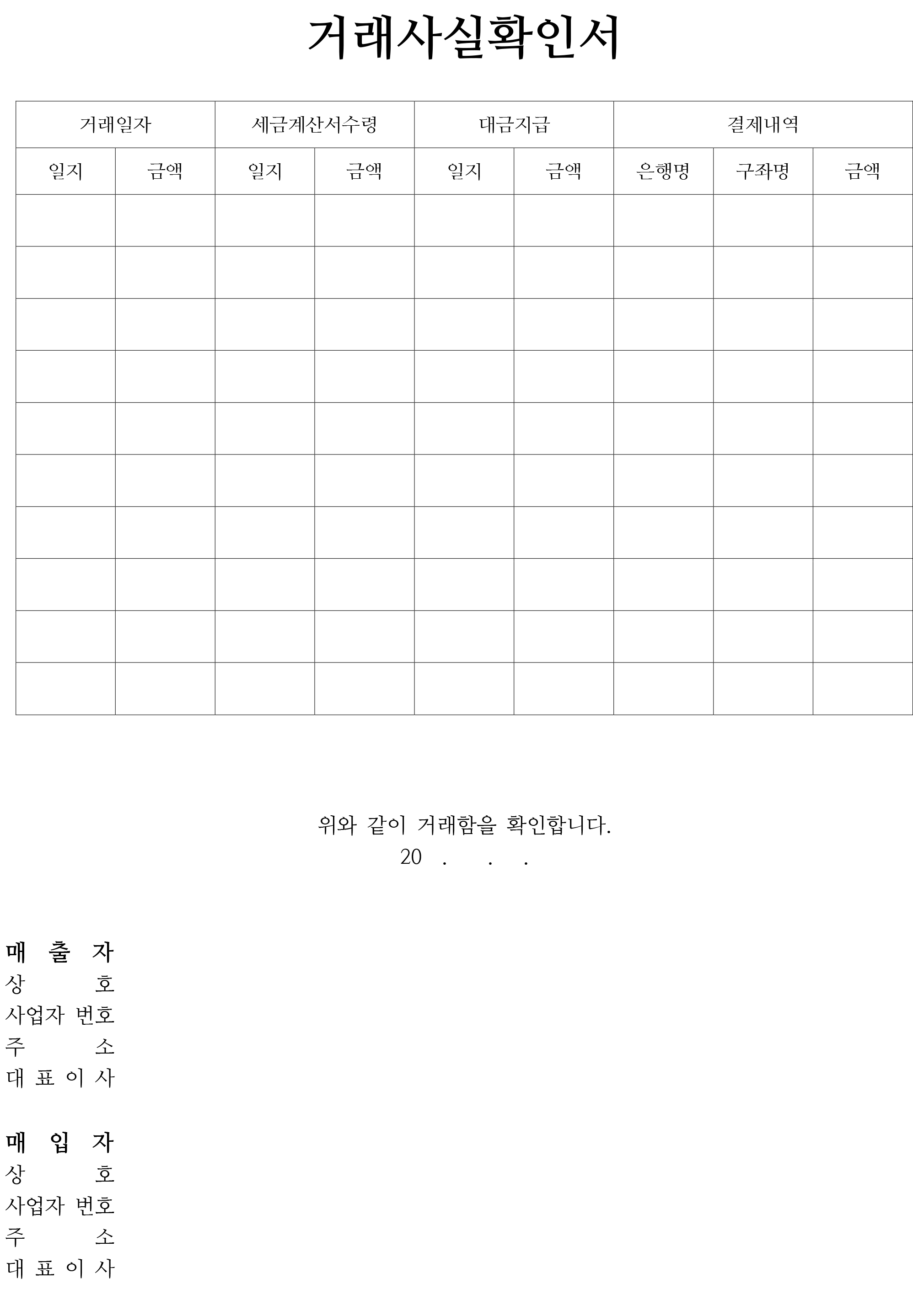 거래일자와 세금계산서 수령, 대금지급, 결제내역 등 각각의 칸에 일지와 금액을 기재할 수 있으며, 상호, 사업자번호, 주소, 대표이사 등을 각각 기재할 수 있는 매출자와 매입자의 인적사항 란이 하단으로 구성되어 있습니다.