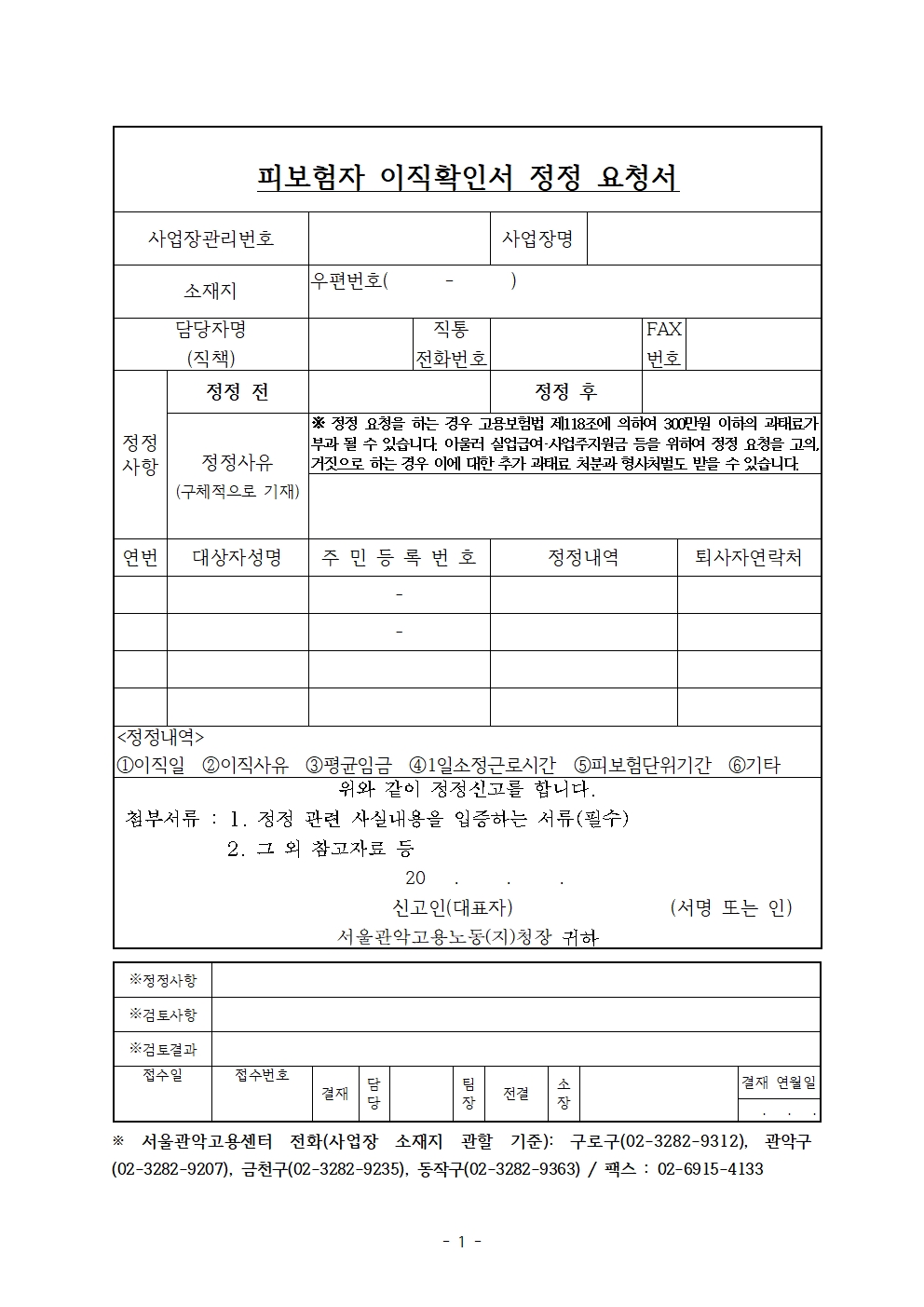 3번 파일은 서울관악고용센터 서식을 참고하였으며, 정정요청서는 해당되는 관할 지점의 사이트로 방문하시면 되십니다. 피보험자 이직확인서와 이직확인서 발급 요청서 양식, 이직확인서 정정 요청서까지 수정이나 변경 없이 표준 서식으로 첨부한 시간이었으며 도움 되는 자료가 되셨길 바랍니다.