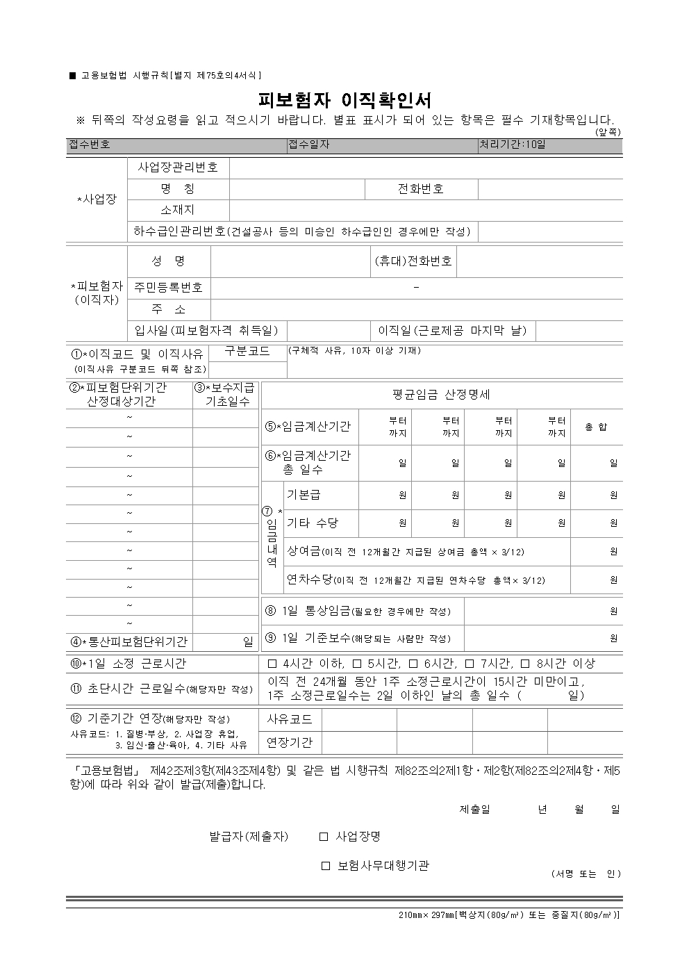 피보험자 자격에 해당이 되는 이직확인서 양식 서류를 원본 그대로 첨부했습니다. 실업급여를 신청하는데 필요한 서식이지만 표준 서식을 찾기가 어려우신 분들이 이나 한글 hwp 또는 한글이 없어서 pdf 파일로 프린트, 인쇄, 출력 용도로 찾으시는 분들도 계실 것 같아 무료 다운로드가 가능하도록 원본 그대로 업로드를 했습니다.