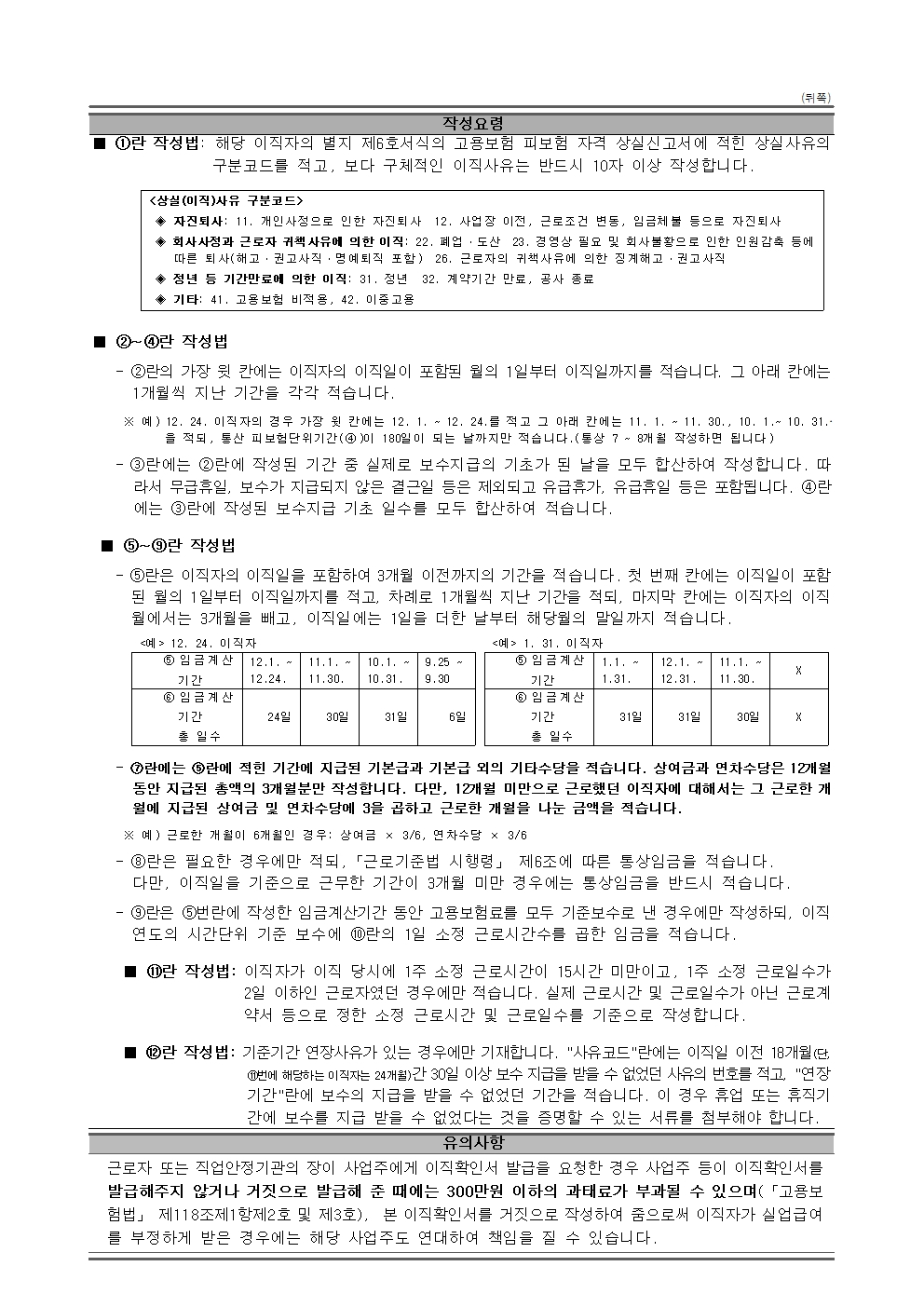 ①란 작성법: 해당 이직자의 별지 제6호서식의 고용보험 피보험 자격 상실신고서에 적힌 상실사유의구분코드를 적고, 보다 구체적인 이직사유는 반드시 10자 이상 작성합니다.