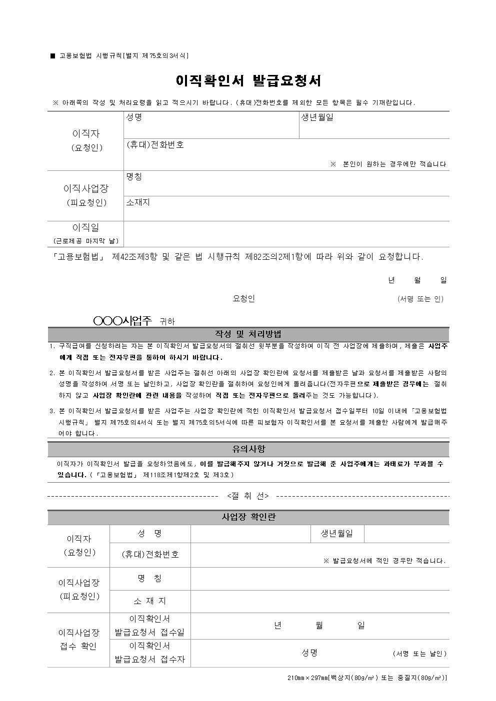 2. 본 이직확인서 발급요청서를 받은 사업주는 절취선 아래의 사업장 확인란에 요청서를 제출받은 날과 요청서를 제출받은 사람의 성명을 작성하여 서명 또는 날인하고, 사업장 확인란을 절취하여 요청인에게 돌려줍니다(전자우편으로 제출받은 경우에는 절취하지 않고 사업장 확인란에 관련 내용을 작성하여 직접 또는 전자우편으로 돌려주는 것도 가능합니다).