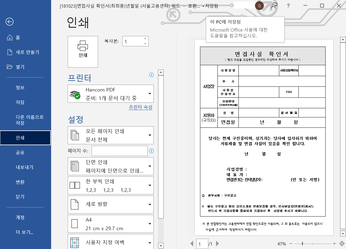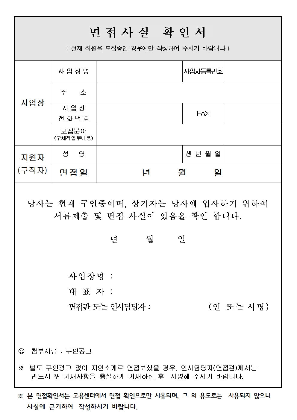 해당 면접사실 확인서 양식을 워드 파일로 재편집을 하여 첨부했습니다. 한글이 없으셔서 hwp 파일을 열 수 없으셨던 분들에게 도움이 되는 자료가 되었으면 좋겠네요.