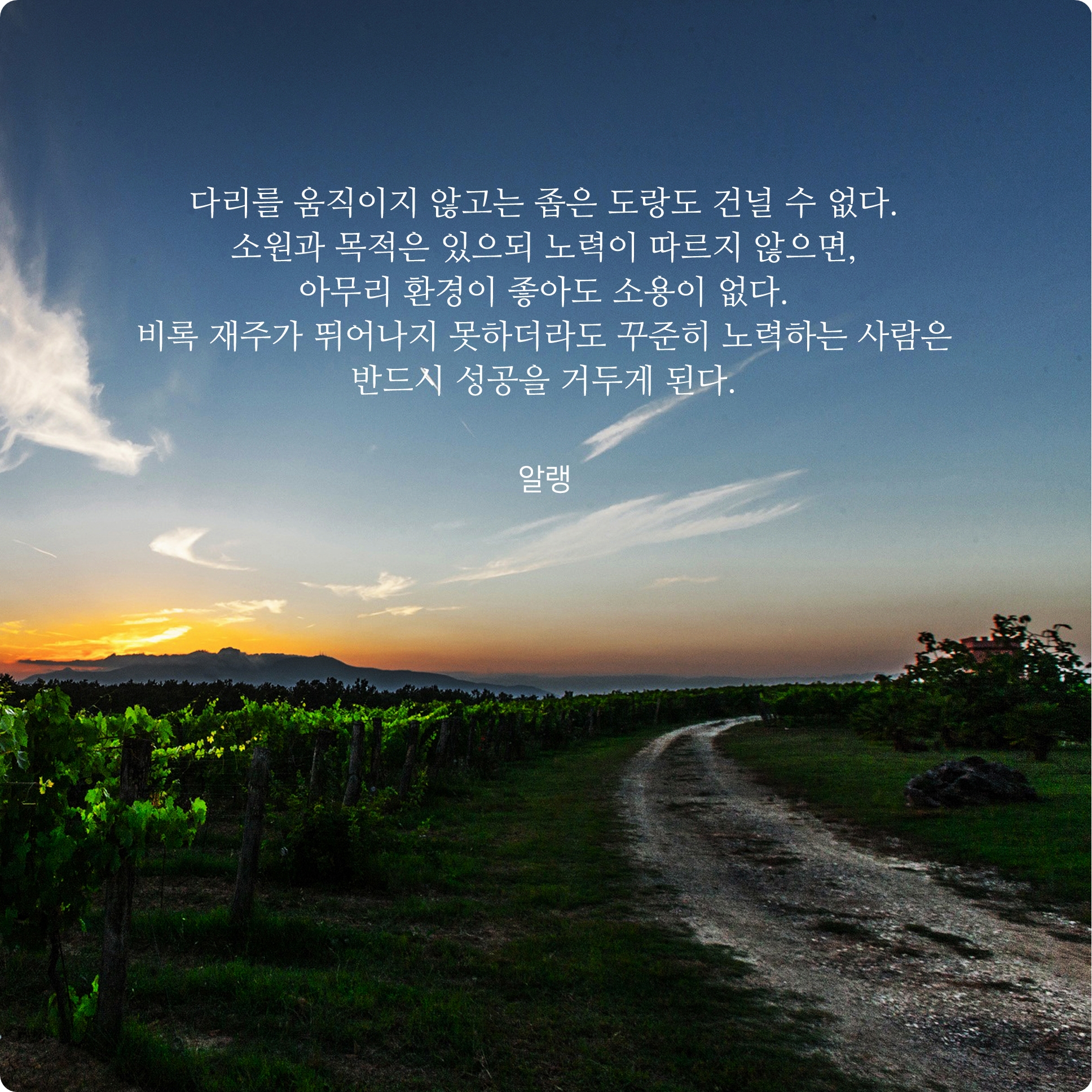 제가 가장 좋아하는 명언 중 하나랍니다. 단순히 능력이나 실력이 남들보다 우월한게 중요한 것이 아니랍니다. 내가 바라는 하나의 뜻이 있다면 그 뜻을 이루기 위해 차근차근 노력을 해야할 것이며, 그 노력은 내가 충분히 즐길 수 있는 과정이 된다면 선천적으로 남들보다 우월한 능력과 실력은 무용지물이 되는 것이죠. 더불어 부족한 능력들을 채워나갈 수 있는 아주 중요한 과정들을 겪을 수가 있는 것이죠. 인생은 끊임없이 학습하고 부족한 부분들을 채워나가면서 내 역량을 조금씩 크게 만들어가는 것이 중요하니깐요.
