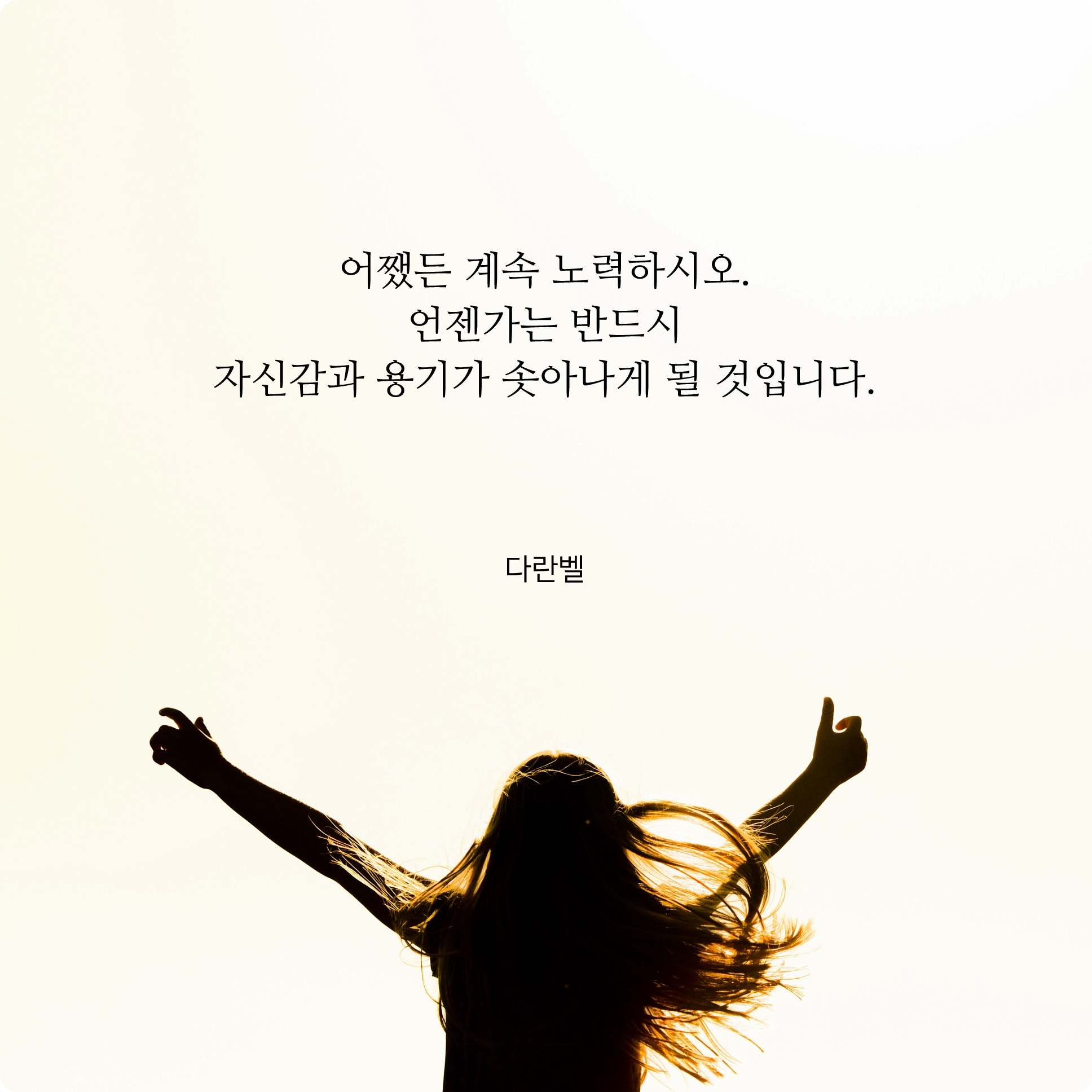어떤 상황이 있든 간에 계속해서 포기하지 말고 노력을 하라는 그런 끈기명언인데요. 이 글을 읽어보니 아무래도 지금 하던 것을 앞으로도 계속 해나가야겠다는 생각이 들더라구요. 시간이 지나면 자신감을 찾고 더 큰 용기가 생겨날 것이라고 믿고 싶습니다.