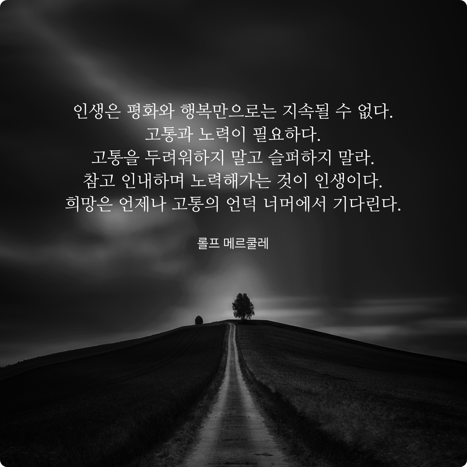 지금 이 고비, 이 언덕만 넘는다면 반드시 좀 더 나은 삶이 우리를 반겨 줄 것이랍니다. 설령 그 언덕 너머로 실패와 절망이 기다리고 있을 수도 있습니다. 다만 그런 모든 과정들 속에서 이겨낼 수 있는 원초적인 강인함을 갖추어야 이런 위기들을 극복해나갈 수 있습니다.