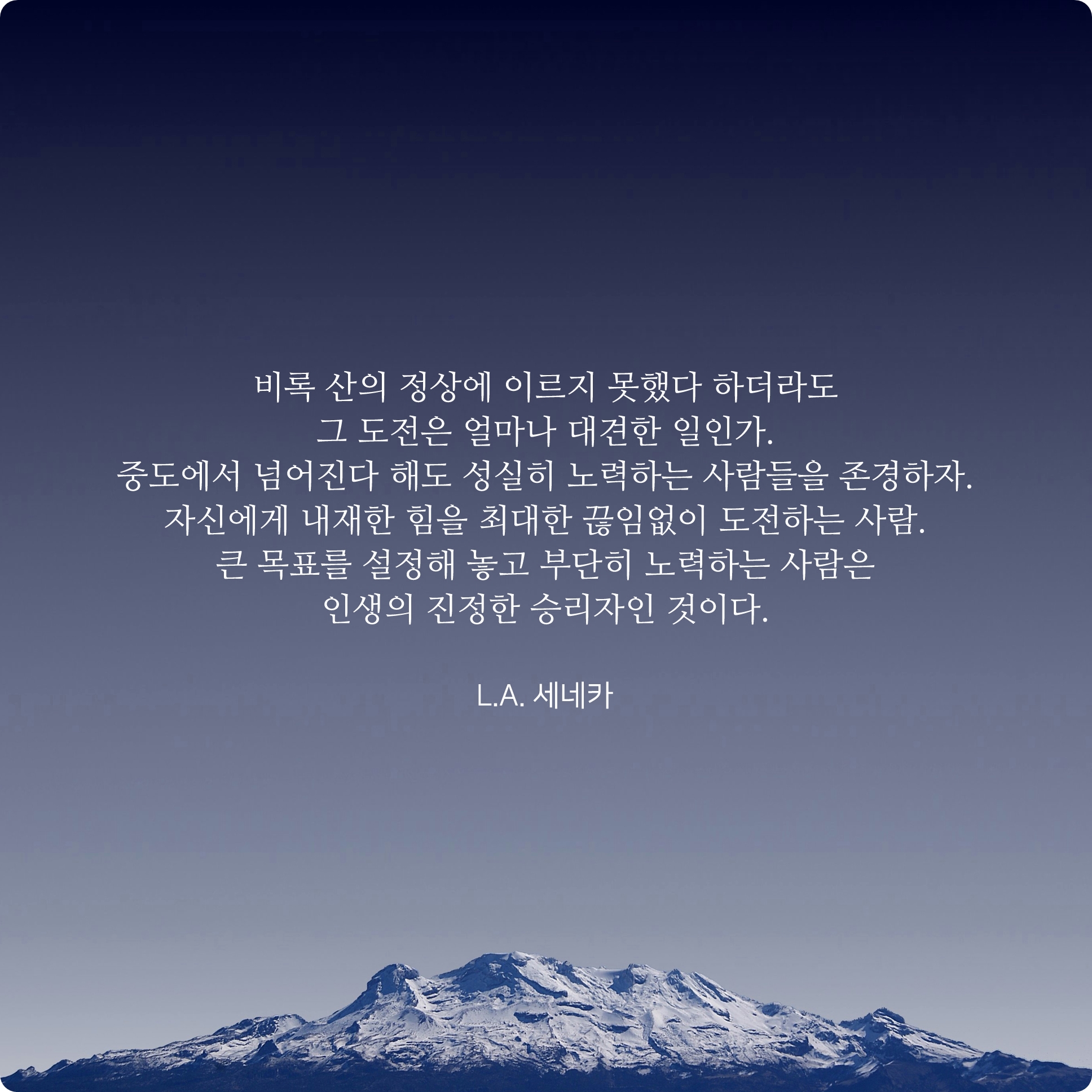 정상이 올라서지 못했더라도 무엇인가를 위해서 도전을 했다는 것은 위대한 일입니다. 대부분의 사람들은 똑같은 생각과 아이디어가 있어도 금새 사라지거나 아예 시도조차 하지 않는 경우가 대부분이니깐요. 부단히 수많은 어려움과 역경을 이겨내고 노력하는 사람이 인생의 진정한 승리자라고 표현한 감동 명언입니다.