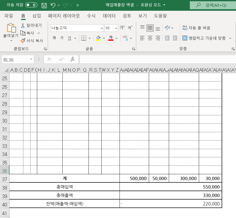 만약 상단에 금액을 기입한 다음 스크롤을 내리면 하단에 각 항목의 총 합계금액이 나오고 총 매입액과 총매출액 순으로 자동으로 계산이 되며, 매출액에서 매입액이 빠진 잔액 금도 자동으로 계산되도록 제작하였습니다.