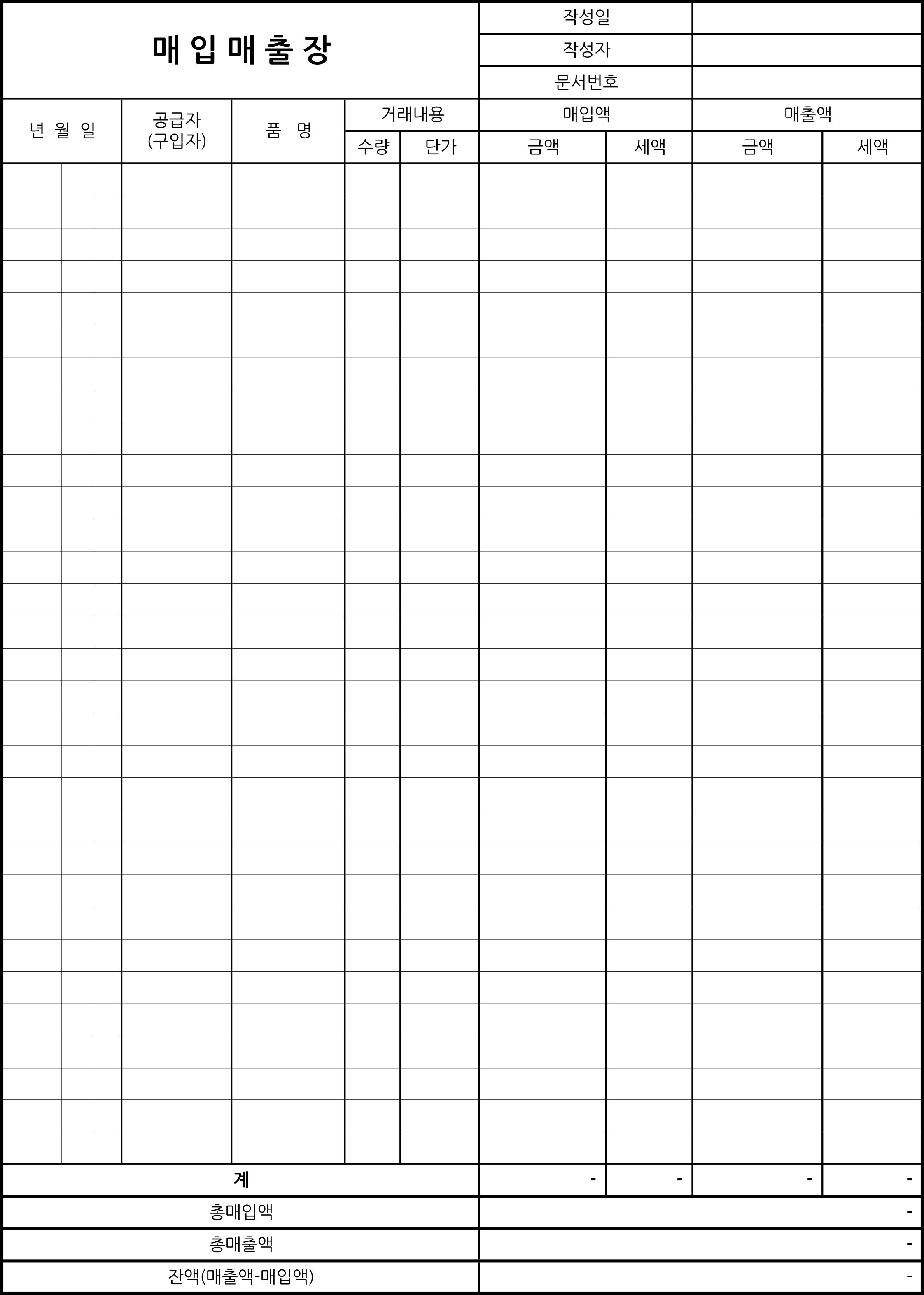 아래에 첨부된 파일을 저장후 열었을 때의 모습입니다. 상단 우측에는 작성일, 작성자, 문서번호 등을 입력되어 있으나 사업자번호나 대표번호, 주소 등으로 수정하셔도 됩니다. 품목 부분에는 날짜와 공급자(구입자), 품명, 수량과 단가 등의 거래 내용, 세액 부분이 별도로 표기된 매입액과 매출액 칸으로 각각 나뉘어 있습니다.