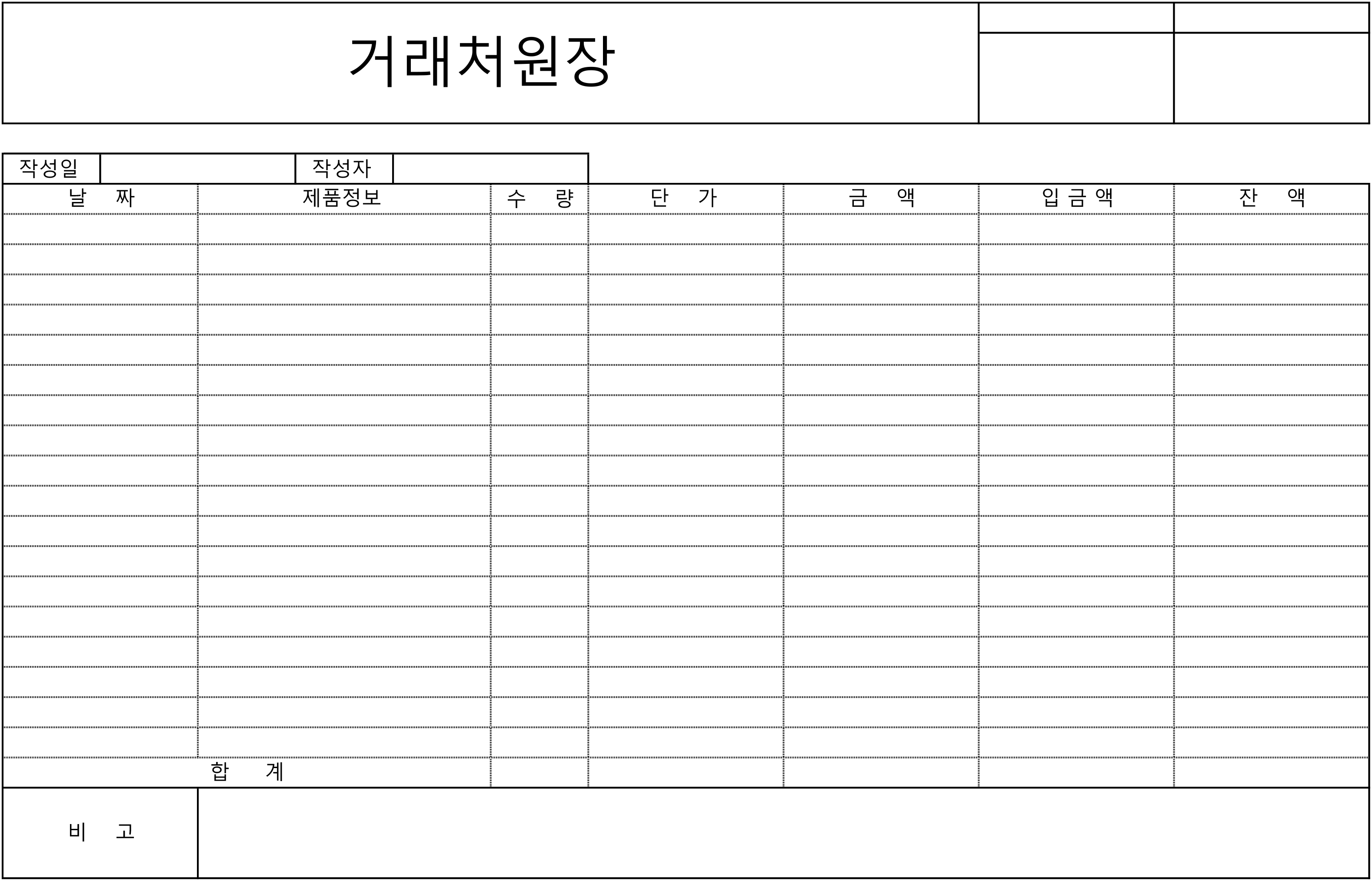 첫번째 첨부된 파일이 엑셀 xls 파일로 제작된 거래처원장 양식이며, 두 번째는 pdf 파일입니다. 수금이 원활하게 이루어지길 기원하며 모든 사업주분들에게 도움이 되셨으면 좋겠습니다.