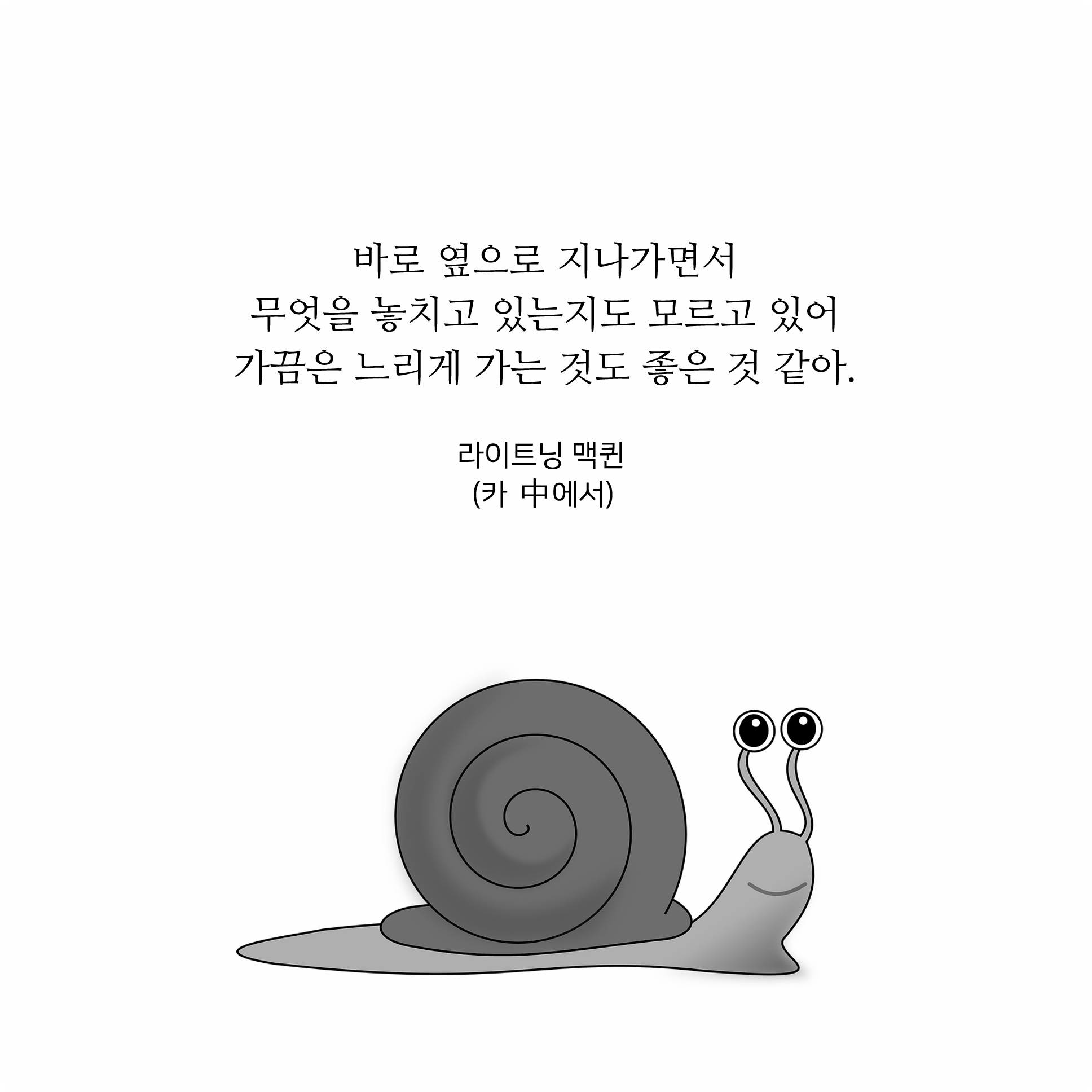 애니메이션 '카'를 보신 적 있으신가요? 꾀나 뻔한 스토리일 것 같지만 탄탄한 스토리와 뚜렷한 캐릭터들 때문에 감명깊게 본 작품 중 하나인데요. 이 애니메이션 안에서 항상 스피트만이 최고라고 생각했었던 라이트닝 맥퀸이 했던 대사가 있었습니다. 빠르게만 가다보니 놓치는 것이 많은 것 같다. 가끔은 느리게 가는 것도 좋은 것 같다. 인생도 어떤 목적만을 살아가기보다는 여러 과정들과 주변것들에 대한 의미를 찾아가면서 목표를 향해 나아가는 자세가 중요한 것 같습니다.