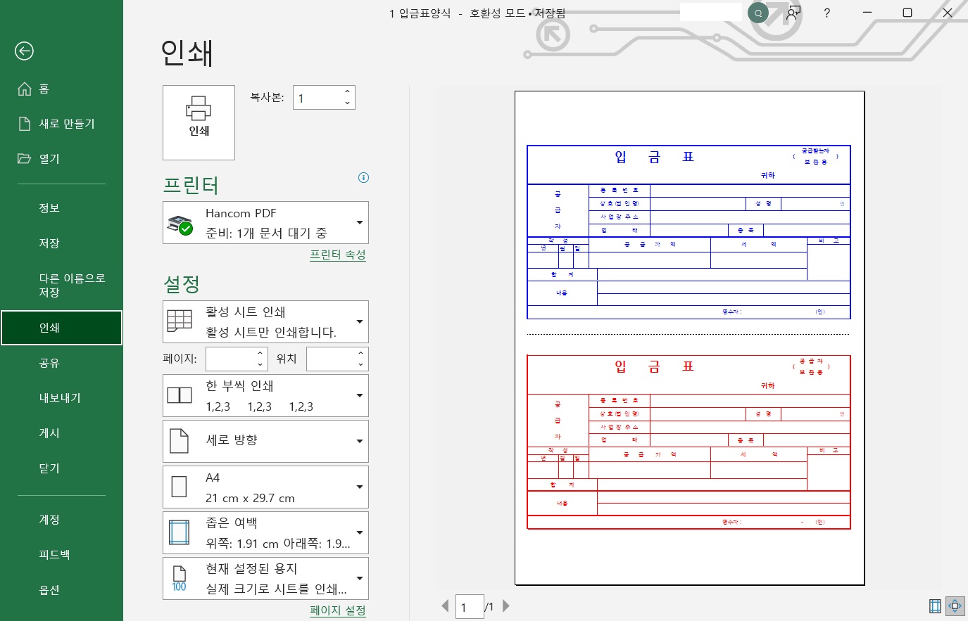 인쇄, 프린트 하기 전 미리 보기 했을 때의 화면입니다. a4 크기이기 때문에 한 장에 딱 맞게 출력이 가능합니다.