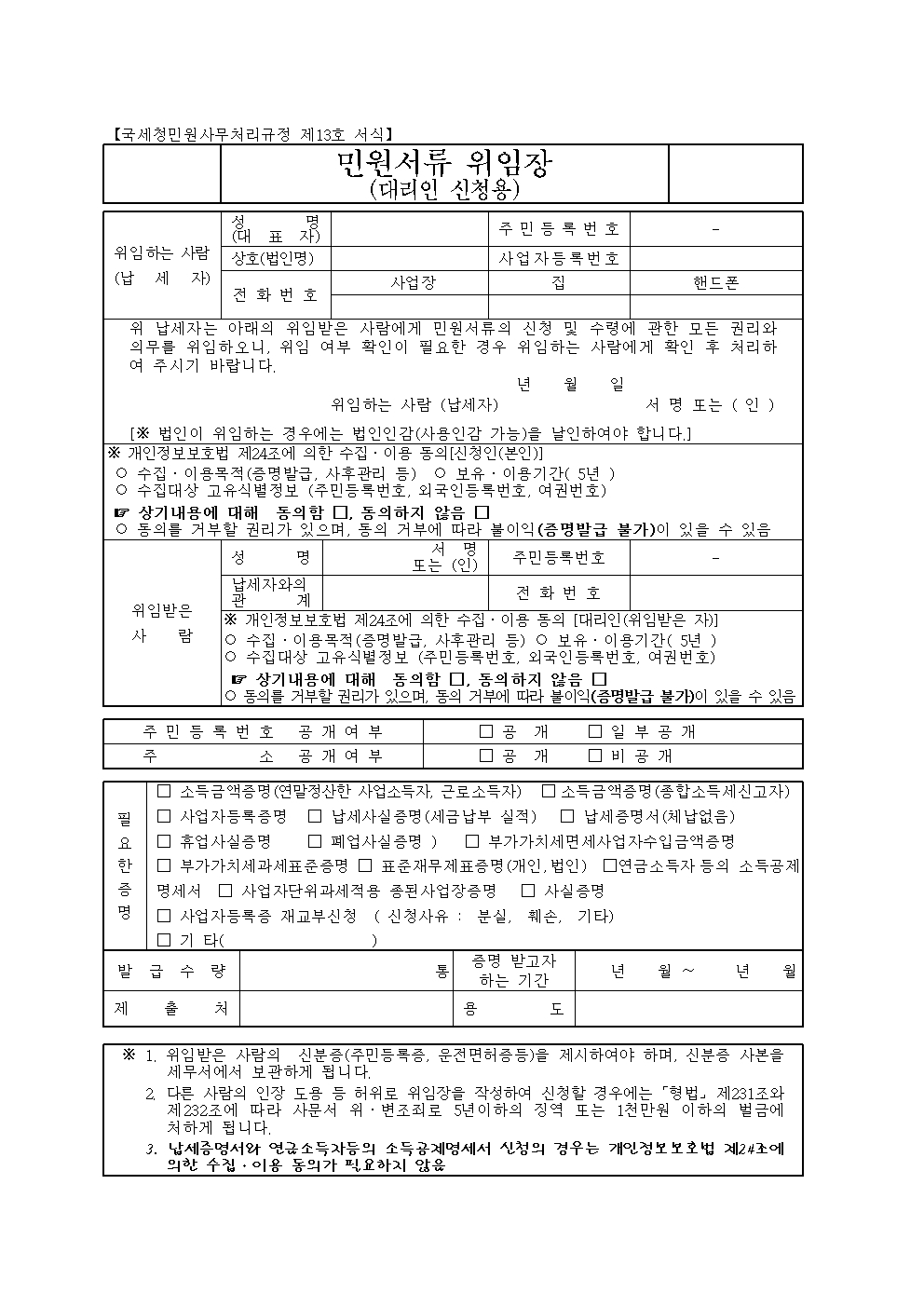 한글과의 호환성 문제로 기존 서식의 폰트를 10에서 9로 수정하였으며, a4 한 장에 딱 맞게 프린트되도록 수정하여 업로드했습니다. 이상 오늘은 세무서 위임장 양식을 원본으로 첨부하였으며 도움이 되는 자료가 되셨길 기원합니다.