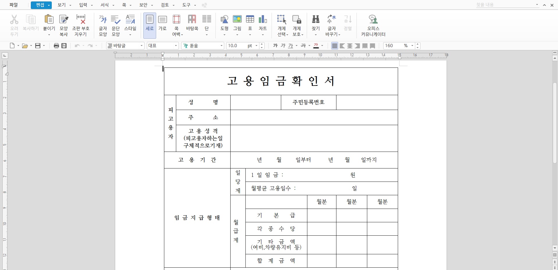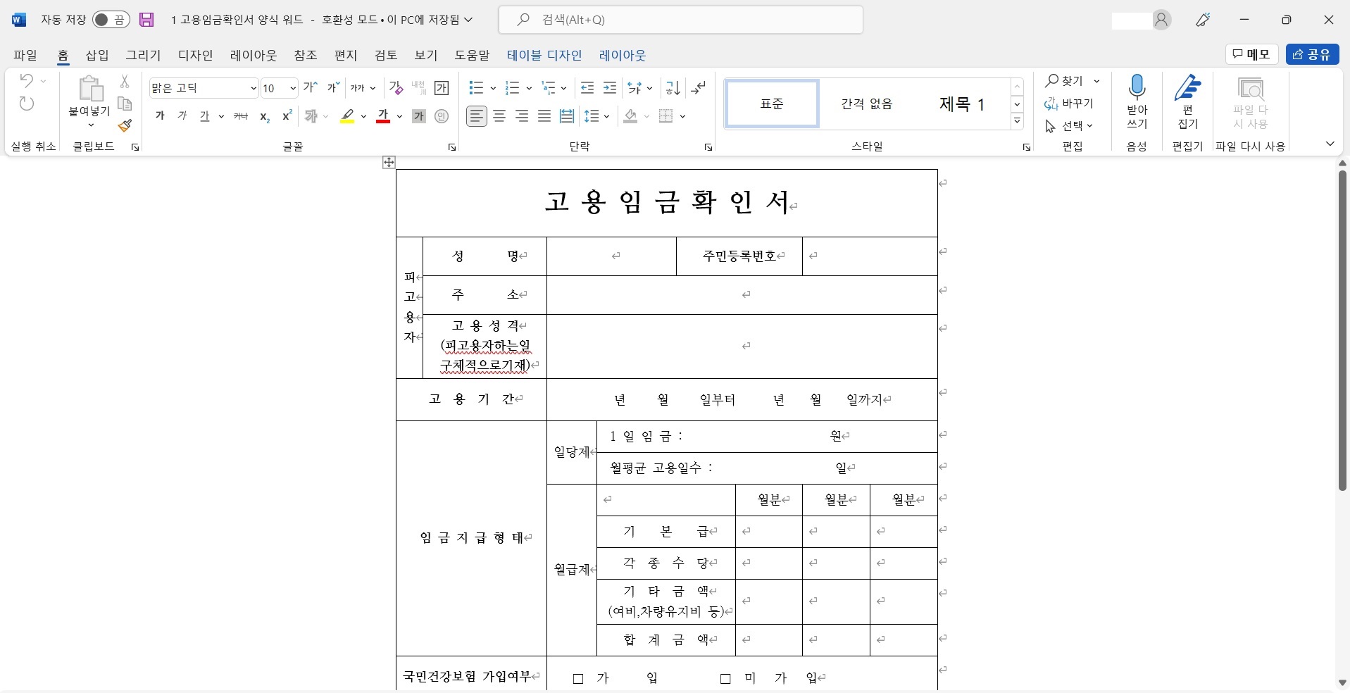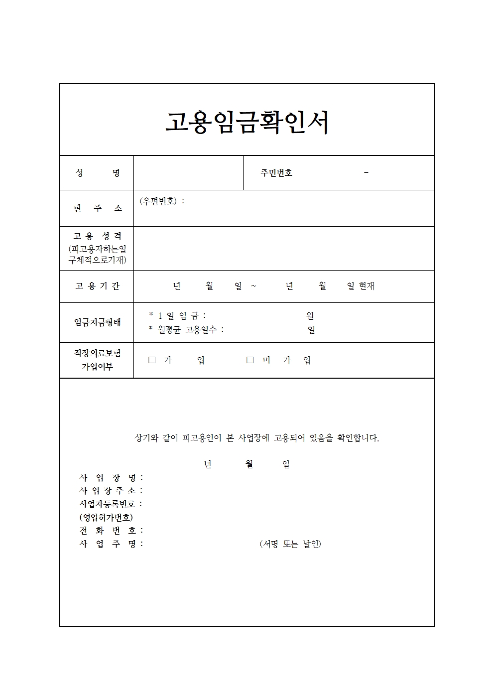 고용기간과 임금지급형태, 직장의료보험 가입 여부 등을 간단하게 기재할 수 있는 깔끔한 고용임금확인서 양식입니다. 마찬가지로 hwp, pdf 파일 두 가지로 첨부했습니다.